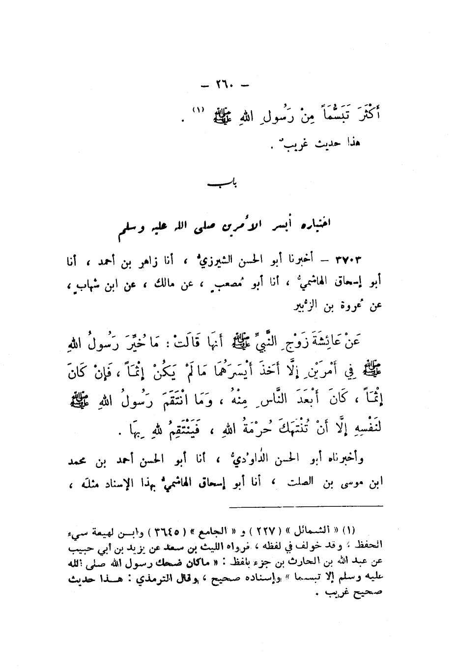 3703 - أَخْبَرَنَا أَبُو الْحَسَنِ الشِّيرَزِيُّ، أَنا زَاهِرُ بْنُ أَحْمَدَ، أَنا أَبُو إِسْحَاقَ الْهَاشِمِيُّ، أَنا أَبُو مُصْعَبٍ، عَنْ مَالِكٍ، عَنِ ابْنِ شِهَابٍ، عَنْ عُرْوَةَ بْنِ الزُّبَيْرِ، عَنْ عَائِشَةَ زَوْجِ النَّبِيِّ صَلَّى اللهُ عَلَيْهِ وَسَلَّمَ، أَنَّهَا قَالَتْ: «مَا خُيِّرَ رَسُولُ اللَّهِ صَلَّى اللهُ عَلَيْهِ وَسَلَّمَ فِي أَمْرَيْنِ إِلا أَخَذَ أَيْسَرَهُمَا مَا لَمْ يَكُنْ إِثْمًا، فَإِنْ كَانَ إِثْمًا، كَانَ أَبْعَدَ النَّاسِ مِنْهُ، وَمَا انْتَقَمَ رَسُولُ اللَّهِ صَلَّى اللهُ عَلَيْهِ وَسَلَّمَ لِنَفْسِهِ إِلا أَنْ تُنْتَهَكَ حُرْمَةُ اللَّهِ، فَيَنْتَقِمُ لِلَّهِ بِهَا».
