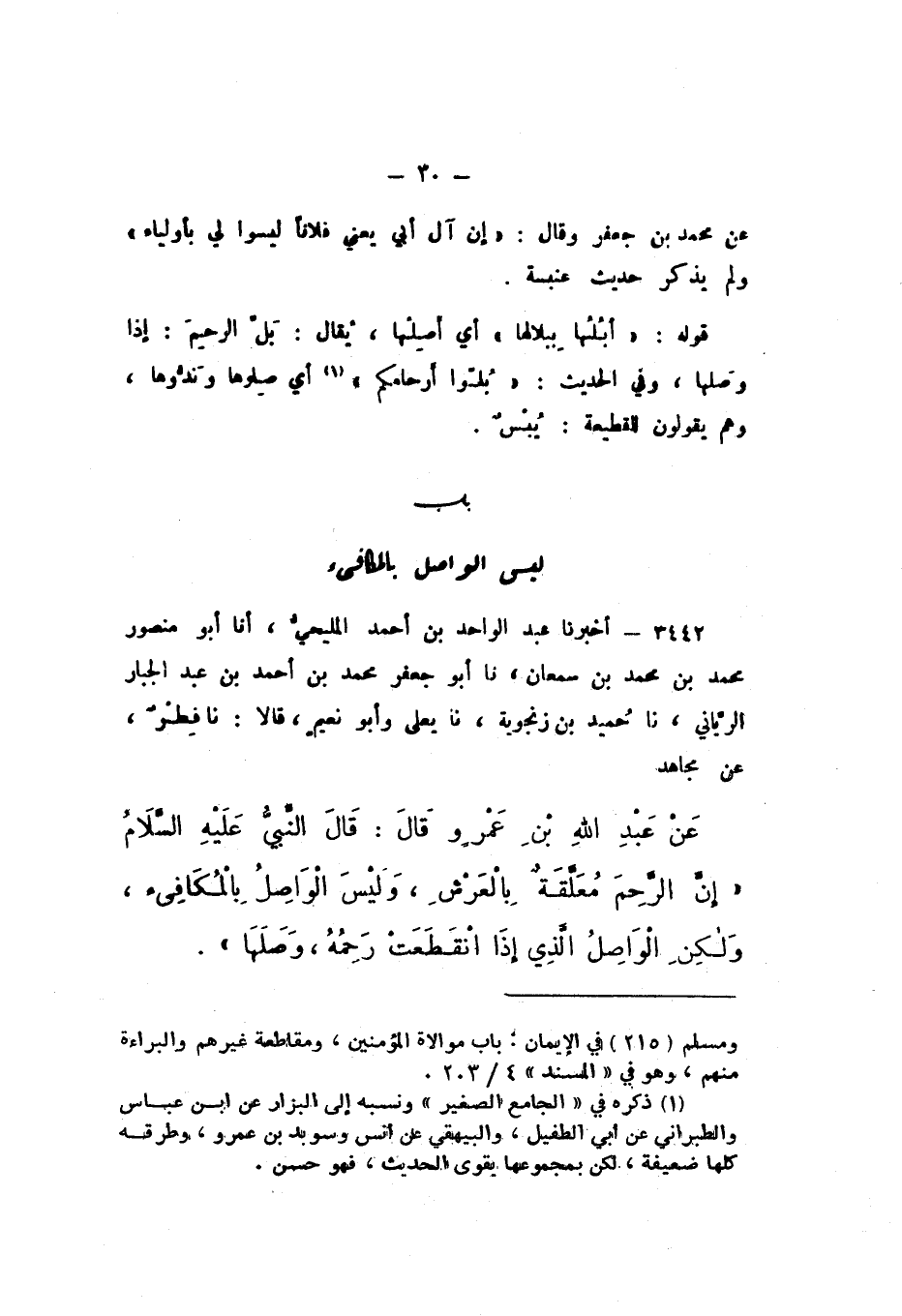 3442 - أَخْبَرَنَا عَبْدُ الْوَاحِدِ بْنُ أَحْمَدَ الْمَلِيحِيُّ، أَنا أَبُو مَنْصُورٍ مُحَمَّدُ بْنُ مُحَمَّدِ بْنِ سَمْعَانَ، نَا أَبُو جَعْفَرٍ مُحَمَّدُ بْنُ أَحْمَدَ بْنِ عَبْدِ الْجَبَّارِ الرَّيَّانِيُّ، نَا حُمَيْدُ بْنُ زَنْجُوَيْهِ، نَا يَعْلَى، وَأَبُو نُعَيْمٍ، قَالا: نَا فِطْرٌ، عَنْ مُجَاهِدٍ، عَنْ عَبْدِ اللَّهِ بْنِ عَمْرٍو، قَالَ: قَالَ النَّبِيُّ عَلَيْهِ السَّلامُ «إِنَّ الرَّحِمَ مُعَلَّقَةٌ بِالْعَرْشِ، وَلَيْسَ الْوَاصِلُ بِالْمُكَافِئِ، وَلَكِنَّ الْوَاصِلَ الَّذِي إِذَا انْقَطَعَتْ رَحِمُهُ وَصَلَهَا».