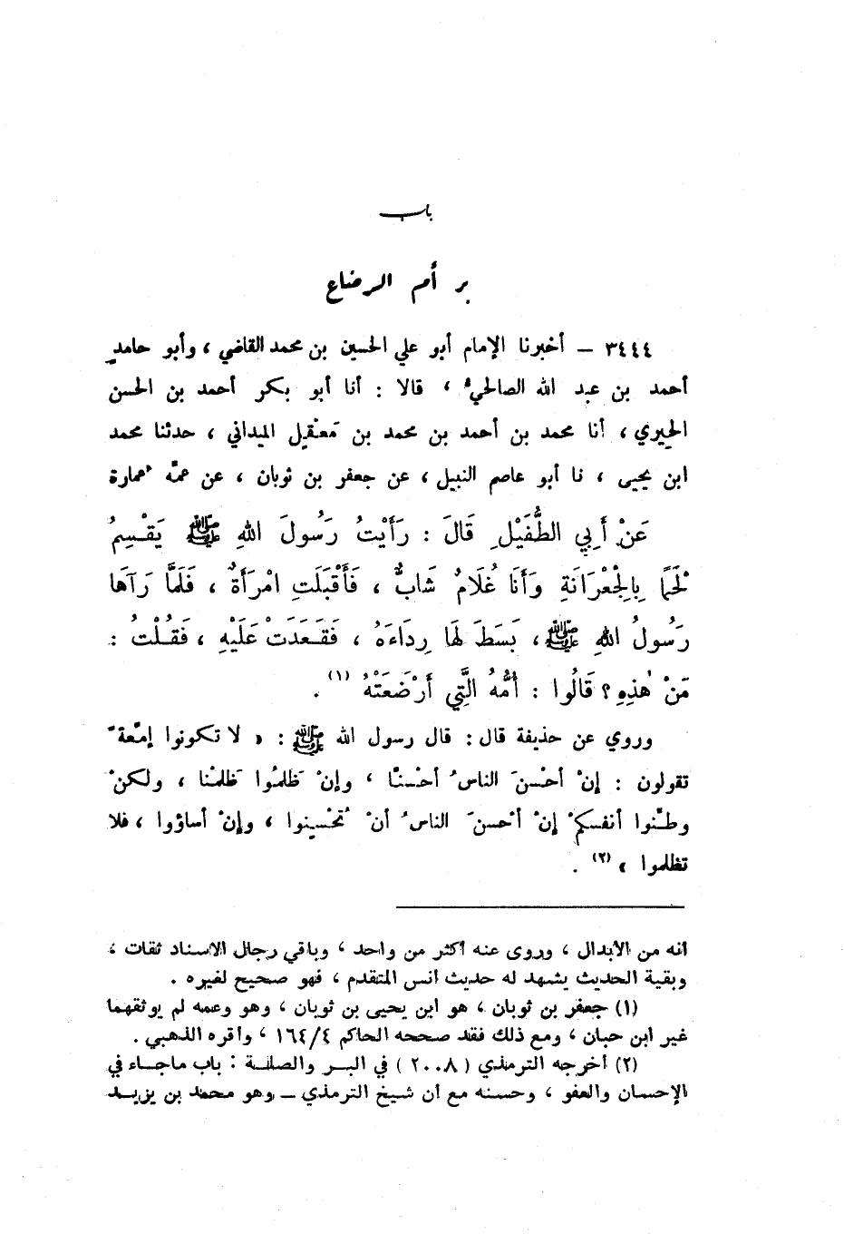 3444 - أَخْبَرَنَا الإِمَامُ أَبُو عَلِيٍّ الْحُسَيْنُ بْنُ مُحَمَّدٍ الْقَاضِي، وَأَبُو حَامِدٍ أَحْمَدُ بْنُ عَبْدِ اللَّهِ الصَّالِحِيُّ، قَالا: أَنا أَبُو بَكْرٍ أَحْمَدُ بْنُ الْحَسَنِ الْحِيرِيُّ، أَنا مُحَمَّدُ بْنُ أَحْمَدَ بْنِ مُحَمَّدِ بْنِ مَعْقِلٍ الْمَيْدَانِيُّ، حَدَّثَنَا مُحَمَّدُ بْنُ يَحْيَى، نَا أَبُو عَاصِمٍ النَّبِيلُ، عَنْ جَعْفَرِ بْنِ ثَوْبَانَ، عَنْ عَمِّهِ عُمَارَةَ، عَنْ أَبِي الطُّفَيْلِ، قَالَ: " رَأَيْتُ رَسُولَ اللَّهِ صَلَّى اللهُ عَلَيْهِ وَسَلَّمَ يَقْسِمُ لَحْمًا بِالْجِعْرَانَةِ وَأَنَا غُلامٌ شَابٌّ، فَأَقْبَلَتِ امْرَأَةٌ، فَلَمَّا رَآهَا رَسُولُ اللَّهِ صَلَّى اللهُ عَلَيْهِ وَسَلَّمَ، بَسَطَ لَهَا رِدَاءَهُ، فَقَعَدَتْ عَلَيْهِ، فَقُلْتُ: مَنْ هَذِهِ؟ قَالُوا: أُمُّهُ الَّتِي أَرْضَعَتْهُ "