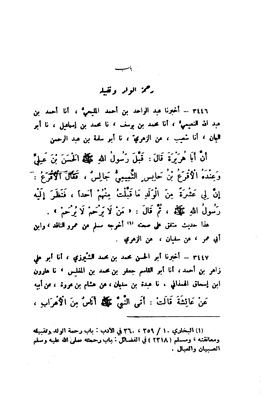 3446 - أَخْبَرَنَا عَبْدُ الْوَاحِدِ بْنُ أَحْمَدَ الْمَلِيحِيُّ، أَنا أَحْمَدُ بْنُ عَبْدِ اللَّهِ النُّعَيْمِيُّ، أَنا مُحَمَّدُ بْنُ يُوسُفَ، نَا مُحَمَّدُ بْنُ إِسْمَاعِيلَ، نَا أَبُو الْيَمَانِ، أَنا شُعَيْبٌ، عَنِ الزُّهْرِيِّ، نَا أَبُو سَلَمَةَ بْنُ عَبْدِ الرَّحْمَنِ، أنَّ أَبَا هُرَيْرَةَ، قَالَ: " قَبَّلَ رَسُولُ اللَّهِ صَلَّى اللهُ عَلَيْهِ وَسَلَّمَ الْحَسَنَ بْنَ عَلِيٍّ، وَعِنْدَهُ الأَقْرَعُ بْنُ حَابِسٍ التَّمِيمِيُّ جَالِسٌ، فَقَالَ الأَقْرَعُ: إِنَّ لِي عَشَرَةً مِنَ الْوَلَدِ، مَا قَبَّلْتُ مِنْهُمْ أَحَدًا، فَنَظَرَ إِلَيْهِ رَسُولُ اللَّهِ صَلَّى اللهُ عَلَيْهِ وَسَلَّمَ، ثُمَّ قَالَ: مَنْ لَا يَرْحَمُ لَا يُرْحَمُ ".