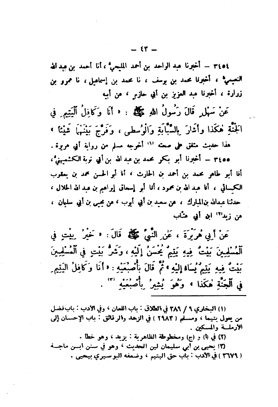3455 - أَخْبَرَنَا أَبُو بَكْرٍ مُحَمَّدُ بْنُ عَبْدِ اللَّهِ بْنِ أَبِي تَوْبَةَ الْكُشْمِيهَنِيُّ، أَنا أَبُو طَاهِرٍ مُحَمَّدُ بْنُ أَحْمَدَ بْنِ الْحَارِثِ، أَنا أَبُو الْحَسَنِ مُحَمَّدُ بْنُ يَعْقُوبَ الْكِسَائِيُّ، أَنا عَبْدُ اللَّهِ بْنُ مَحْمُودٍ، أَنا أَبُو إِسْحَاقَ إِبْرَاهِيمُ بْنُ عَبْدِ اللَّهِ الْخَلالُ، حَدَّثَنَا عَبْدُ اللَّهِ بْنُ الْمُبَارَكِ، عَنْ سَعِيدِ بْنِ أَبِي أَيُّوبَ، عَنْ يَحْيَى بْنِ أَبِي سُلَيْمَانَ، عَنْ زَيْدِ بْنِ أَبِي عتَّابٍ، عَنْ أَبِي هُرَيْرَةَ، عَنِ النَّبِيِّ صَلَّى اللهُ عَلَيْهِ وَسَلَّمَ، قَالَ: " خَيْرُ بَيْتٍ فِي الْمُسْلِمِينَ بَيْتٌ فِيهِ يَتِيمٌ يُحْسَنُ إِلَيْهِ، وَشَرُّ بَيْتٍ فِي الْمُسْلِمِينَ بَيْتٌ فِيهِ يَتِيمٌ يُسَاءُ إِلَيْهِ، ثُمَّ قَالَ بأُصْبُعَيْهِ: أَنَا وَكَافِلُ الْيَتِيمِ فِي الْجَنَّةِ هَكَذَا «، وَهُوَ يُشِيرُ بِأُصْبُعَيْهِ»