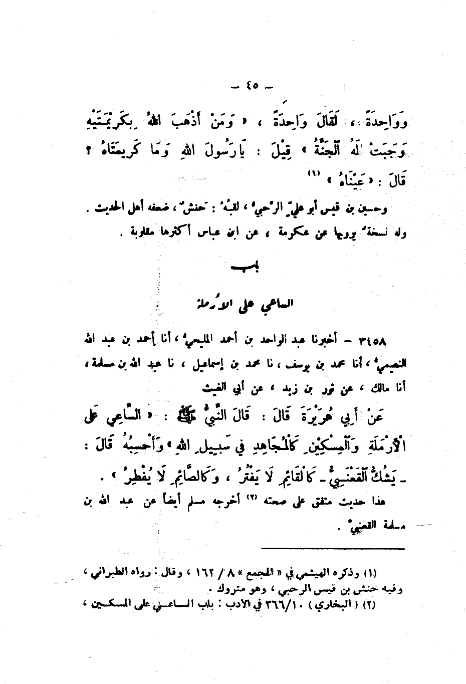 3458 - أَخْبَرَنَا عَبْدُ الْوَاحِدِ بْنُ أَحْمَدَ الْمَلِيحِيُّ، أَنا أَحْمَدُ بْنُ عَبْدِ اللَّهِ النُّعَيْمِيُّ، أَنا مُحَمَّدُ بْنُ يُوسُفَ، نَا مُحَمَّدُ بْنُ إِسْمَاعِيلَ، نَا عَبْدُ اللَّهِ بْنُ مَسْلَمَةَ، أَنا مَالِكٌ، عَنْ ثَوْرِ بْنِ زَيْدٍ، عَنْ أَبِي الْغَيْثِ، عَنْ أَبِي هُرَيْرَةَ، قَالَ: قَالَ النَّبِيُّ صَلَّى اللهُ عَلَيْهِ وَسَلَّمَ: «السَّاعِي عَلَى الأَرْمَلَةِ وَالْمِسْكِينِ كَالْمُجَاهِدِ فِي سَبِيلِ اللَّهِ»، وَأَحْسَبُهُ قَالَ، يَشُكُّ الْقَعْنَبِيُّ: «كَالْقَائِمِ لَا يَفْتُرُ، وَكَالصَّائِمِ لَا يُفْطِرُ».