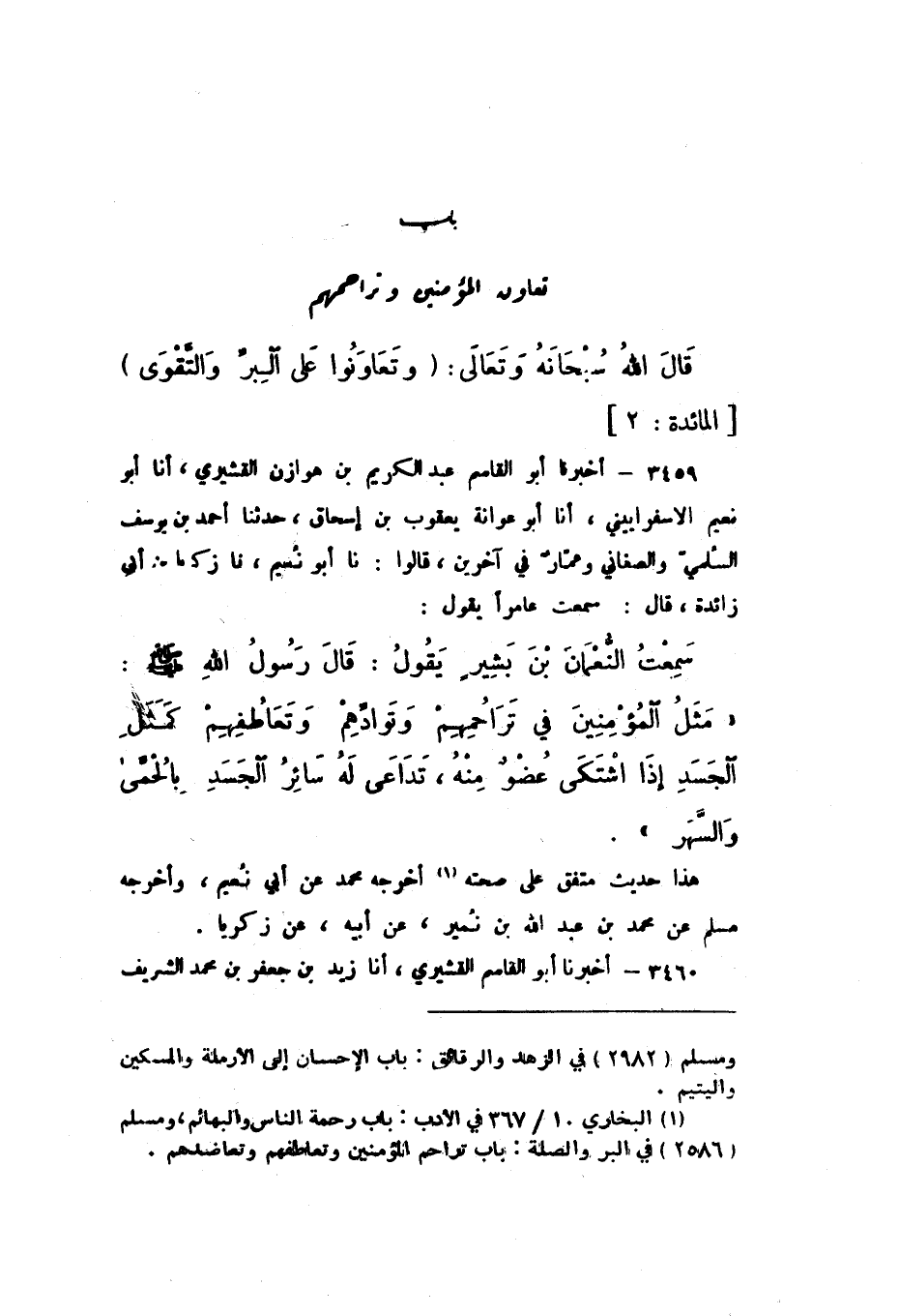 3459 - أَخْبَرَنَا أَبُو الْقَاسِمِ عَبْدُ الْكَرِيمِ بْنُ هَوَازِنَ الْقُشَيْرِيُّ، أَنا أَبُو نُعَيْمٍ الإِسْفَرَايِينِيُّ، أَنا أَبُو عَوَانَةَ يَعْقُوبُ بْنُ إِسْحَاقَ، حَدَّثَنَا أَحْمَدُ بْنُ يُوسُفَ السُّلَمِيُّ، وَالصَّغَانِيُّ، وَعَمَّارٌ، فِي آخَرِينَ، قَالُوا: نَا أَبُو نُعَيْمٍ، نَا زَكَرِيَّا بْنُ أَبِي زَائِدَةَ، قَالَ: سَمِعْتُ عَامِرًا، يَقُولُ: سَمِعْتُ النُّعْمَانَ بْنَ بَشِيرٍ، يَقُولُ: قَالَ رَسُولُ اللَّهِ صَلَّى اللهُ عَلَيْهِ وَسَلَّمَ: «مَثَلُ الْمُؤْمِنِينَ فِي تَرَاحُمِهِمْ وَتَوَادِّهِمْ وَتَعَاطُفِهِمْ كَمَثَلِ الْجَسَدِ إِذَا اشْتَكَى عُضْوٌ مِنْهُ، تَدَاعَى لَهُ سَائِرُ الْجَسَدِ بِالْحُمَّى وَالسَّهَرِ».