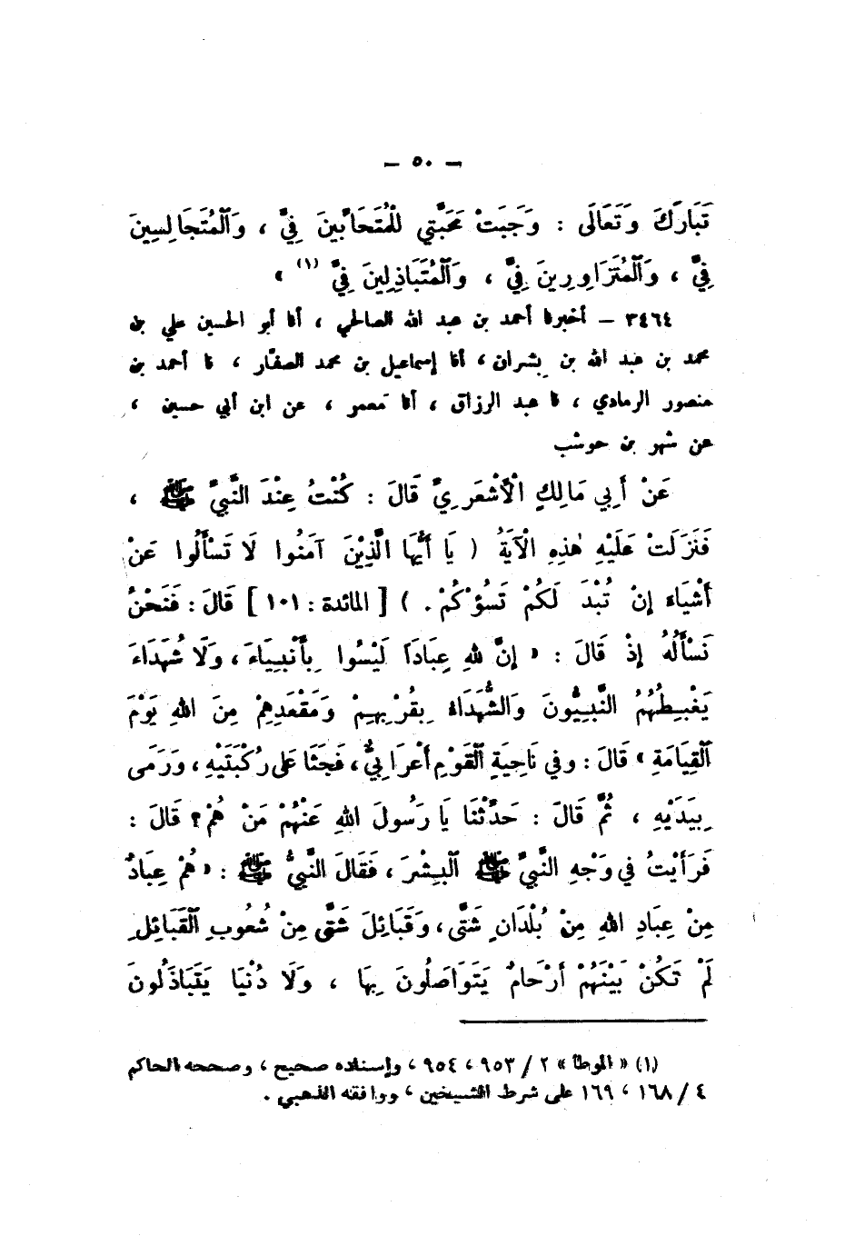 3464 - أَخْبَرَنَا أَحْمَدُ بْنُ عَبْدِ اللَّهِ الصَّالِحِيُّ، أَنا أَبُو الْحُسَيْنِ عَلِيُّ بْنُ مُحَمَّدِ بْنِ عَبْدِ اللَّهِ بْنِ بِشْرَانَ، أَنا إِسْمَاعِيلُ بْنُ مُحَمَّدٍ الصَّفَّارُ، نَا أَحْمَدُ بْنُ مَنْصُورٍ الرَّمَادِيُّ، نَا عَبْدُ الرَّزَّاقِ، أَنا مَعْمَرٌ، عَنِ ابْنِ أَبِي حُسَيْنٍ، عَنْ شَهْرِ بْنِ حَوْشَبٍ، عَنْ أَبِي مَالِكٍ الأَشْعَرِيِّ، قَالَ: " كُنْتُ عِنْدَ النَّبِيِّ صَلَّى اللهُ عَلَيْهِ وَسَلَّمَ، فَنَزَلَتْ عَلَيْهِ هَذِهِ الآيَةُ: {يَأَيُّهَا الَّذِينَ آمَنُوا لَا تَسْأَلُوا عَنْ أَشْيَاءَ إِنْ تُبْدَ لَكُمْ تَسُؤْكُمْ} [الْمَائِدَة: 101]، قَالَ: فَنَحْنُ نَسْأَلُهُ إِذْ قَالَ: إِنَّ لِلَّهِ عِبَادًا لَيْسُوا بِأَنْبِيَاءَ، وَلا شُهَدَاءَ يَغْبِطُهُمُ النَّبِيُّونَ وَالشُّهَدَاءُ بِقُرْبِهِمْ وَمَقْعَدِهِمْ مِنَ اللَّهِ يَوْمَ الْقِيَامَةِ، قَالَ: وَفِي نَاحِيَةِ الْقَوْمِ أَعْرَابِيٌّ، فَجَثَا عَلَى رُكْبَتَيْهِ، وَرَمَى بِيَدَيْهِ، ثُمَّ قَالَ: حَدِّثْنَا يَا رَسُولَ اللَّهِ عَنْهُمْ مَنْ هُمْ؟ قَالَ: فَرَأَيْتُ فِي وَجْهِ النَّبِيِّ صَلَّى اللهُ عَلَيْهِ وَسَلَّمَ الْبِشْرَ، فَقَالَ النَّبِيُّ صَلَّى اللهُ عَلَيْهِ وَسَلَّمَ: هُمْ عِبَادٌ مِنْ عِبَادِ اللَّهِ مِنْ بُلْدَانٍ شَتَّى، وَقَبَائِلَ شَتَّى مِنْ شُعُوبِ الْقَبَائِلِ، لَمْ تَكُنْ بَيْنَهُمْ أَرْحَامٌ يَتَوَاصَلُونَ بِهَا، وَلا دُنْيَا يَتَبَاذَلُونَ