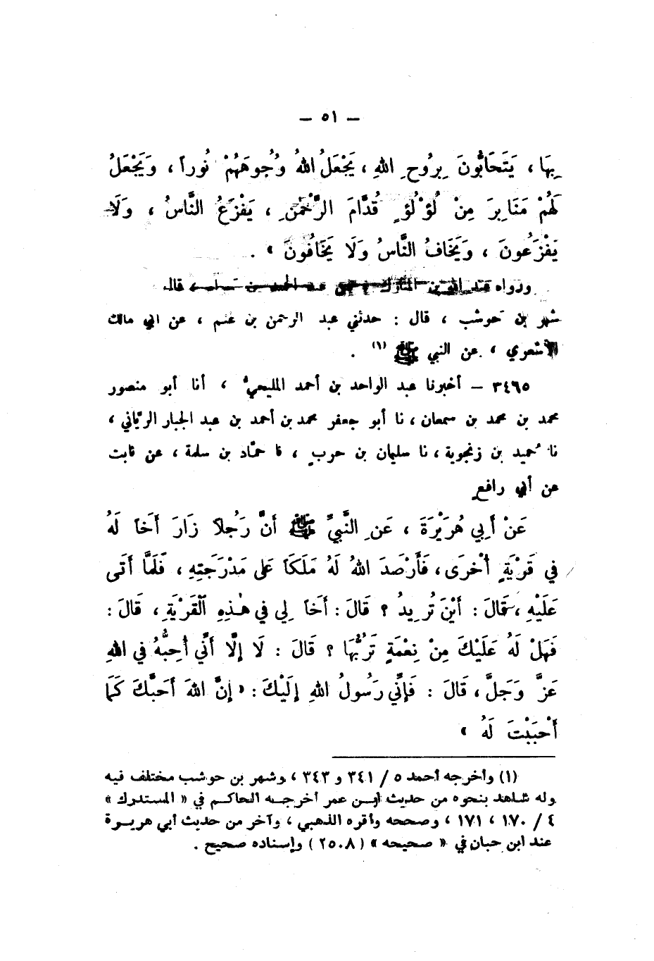 3465 - أَخْبَرَنَا عَبْدُ الْوَاحِدِ بْنُ أَحْمَدَ الْمَلِيحِيُّ، أَنا أَبُو مَنْصُورٍ مُحَمَّدُ بْنُ سَمْعَانَ، نَا أَبُو جَعْفَرٍ مُحَمَّدُ بْنُ أَحْمَدَ بْنِ عَبْدِ الْجَبَّارِ الرَّيَّانِيُّ، نَا حُمَيْدُ بْنُ زَنْجُوَيْهِ، نَا سُلَيْمَانُ بْنُ حَرْبٍ، نَا حَمَّادُ بْنُ سَلَمَةَ، عَنْ ثَابِتٍ، عَنْ أَبِي رَافِعٍ، عَنْ أَبِي هُرَيْرَةَ، عَنِ النَّبِيِّ صَلَّى اللهُ عَلَيْهِ وَسَلَّمَ، " أَنَّ رَجُلا زَارَ أَخًا لَهُ فِي قَرْيَةٍ أُخْرَى، فَأَرْصَدَ اللَّهُ لَهُ مَلَكًا عَلَى مَدْرَجَتِهِ، فَلَمَّا أَتَى عَلَيْهِ، قَالَ: أَيْنَ تُرِيدُ؟ قَالَ: أَخًا لِي فِي هَذِهِ الْقَرْيَةِ، قَالَ: فَهَلْ لَهُ عَلَيْكَ مِنْ نِعْمَةٍ تَرُبُّهَا؟ قَالَ: لَا إِلا أَنِّي أُحِبُّهُ فِي اللَّهِ عَزَّ وَجَلَّ، قَالَ: فَإِنِّي رَسُولُ اللَّهِ إِلَيْكَ: إِنَّ اللَّهَ أَحَبَّكَ كَمَا أَحْبَبْتَ لَهُ ".