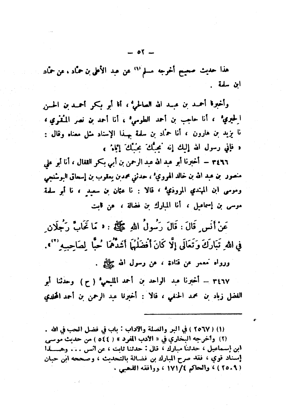 3465 - وَأَخْبَرَنَا أَحْمَدُ بْنُ عَبْدِ اللَّه الصَّالِحِيُّ، أَنَا أَبُو بَكْرٍ أَحْمَدُ بْنُ الْحَسَنِ الْحِيرِيُّ، أَنَا حَاجِبُ بْنُ أَحْمَدَ الطُّوسِيُّ، أَنَا أَحْمَدُ بْنُ نَصْرٍ الْمُقْرِي، نَا يَزِيدُ بْنُ هَارُونَ، أَنا حَمَّادُ بْنُ سَلَمَةَ، بِهَذَا الإِسْنَادِ مِثْلَ مَعْنَاهُ، وَقَالَ: «فَإِنِّي رَسُولُ اللَّهِ إِلَيْكَ إِنَّهُ يُحِبُّكَ بِحُبِّكَ إِيَّاهُ»