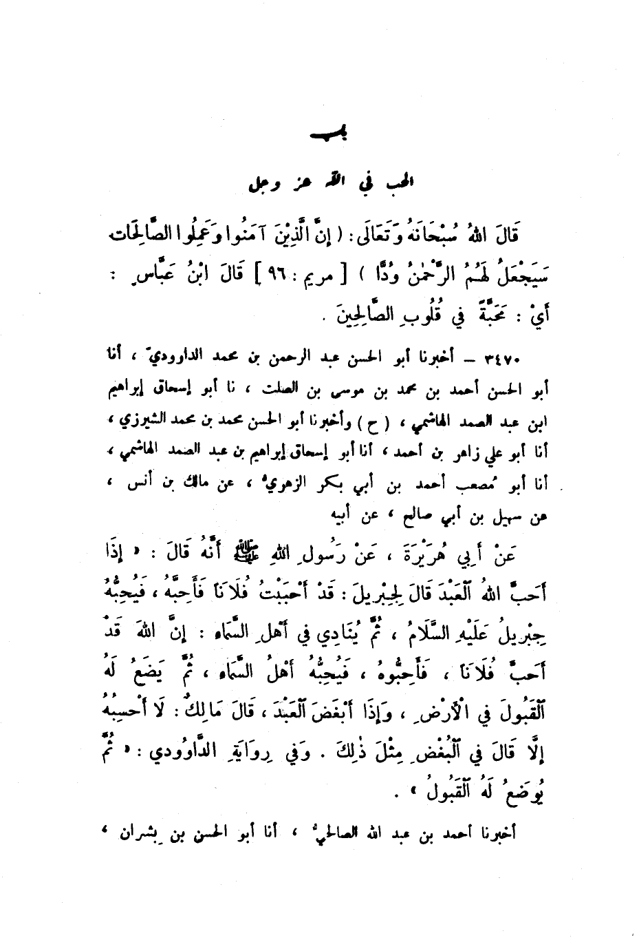 ح، وَأَخْبَرَنَا أَبُو الْحَسَنِ مُحَمَّدُ بْنُ مُحَمَّدٍ الشِّيرَزِيُّ، أَنا أَبُو عَلِيٍّ زَاهِرُ بْنُ أَحْمَدَ، أَنا أَبُو إِسْحَاقَ إِبْرَاهِيمُ بْنُ عَبْدِ الصَّمَدِ الْهَاشِمِيُّ، أَنا أَبُو مُصْعَبٍ أَحْمَدُ بْنُ أَبِي بَكْرٍ الزُّهْرِيُّ، عَنْ مَالِكِ بْنِ أَنَسٍ، عَنْ سُهَيْلِ بْنِ أَبِي صَالِحٍ، عَنْ أَبِيهِ، عَنْ أَبِي هُرَيْرَةَ، عَنْ رَسُولِ اللَّهِ صَلَّى اللهُ عَلَيْهِ وَسَلَّمَ، أَنَّهُ قَالَ: " إِذَا أَحَبَّ اللَّهُ الْعَبْدَ قَالَ لِجِبْرِيلَ: قَدْ أَحْبَبْتُ فُلانًا فَأَحِبَّهُ، فَيُحِبُّهُ جِبْرِيلُ عَلَيْهِ السَّلامُ، ثُمَّ يُنَادِي فِي أَهْلِ السَّمَاءِ: إِنَّ اللَّهَ قَدْ أَحَبَّ فُلانًا، فَأَحِبُّوهُ، فَيُحِبُّهُ أَهْلُ السَّمَاءِ، ثُمَّ يَضَعُ لَهُ الْقَبُولَ فِي الأَرْضِ، وَإِذَا أَبْغَضَ الْعَبْدَ "، قَالَ مَالِكٌ: لَا أَحْسَبُهُ إِلا قَالَ فِي الْبُغْضِ مِثْلَ ذَلِكَ.