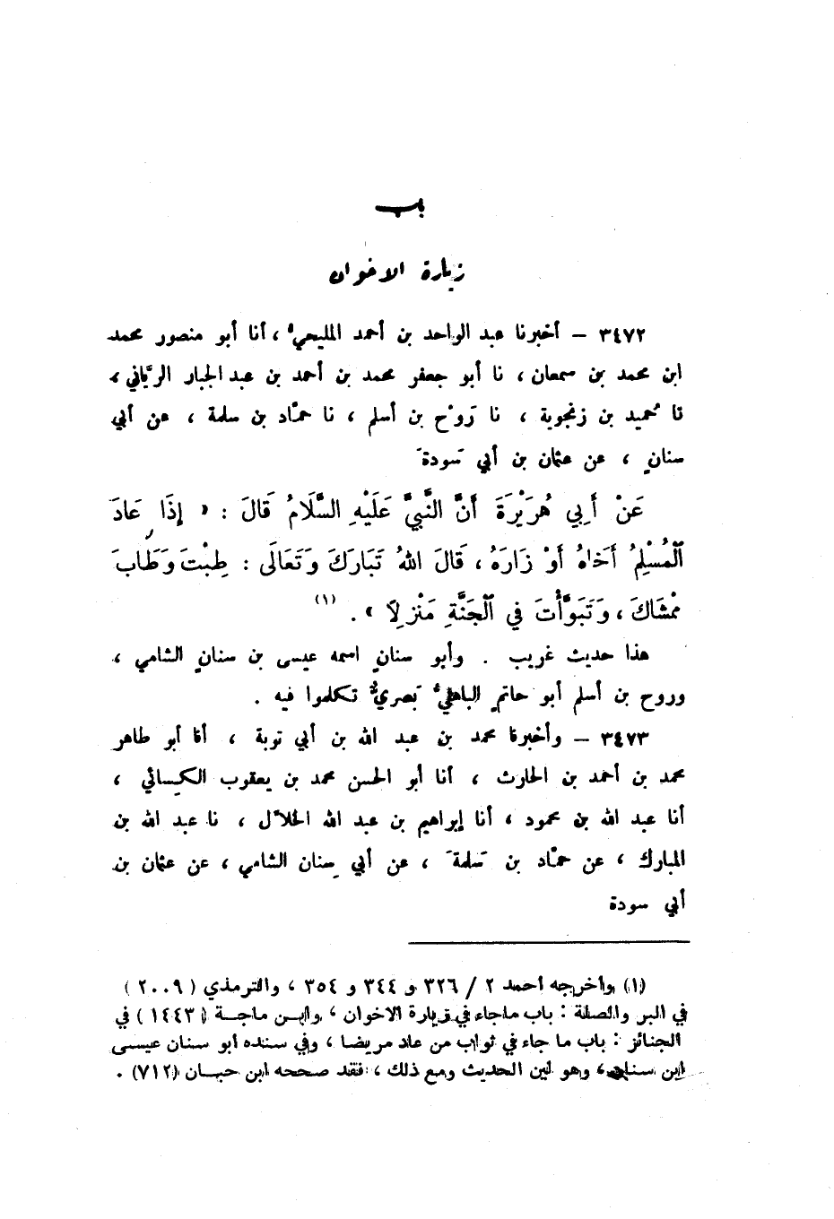 3472 - أَخْبَرَنَا عَبْدُ الْوَاحِدِ بْنُ أَحْمَدَ الْمَلِيحِيُّ، أَنا أَبُو مَنْصُورٍ مُحَمَّدُ بْنُ مُحَمَّدِ بْنِ سَمْعَانَ، نَا أَبُو جَعْفَرٍ مُحَمَّدُ بْنُ أَحْمَدَ بْنِ عَبْدِ الْجَبَّارِ الرَّيَّانِيُّ، نَا حُمَيْدُ بْنُ زَنْجُوَيْهِ، نَا رَوْحُ بْنُ أَسْلَمَ، نَا حَمَّادُ بْنُ سَلَمَةَ، عَنْ أَبِي سِنَانٍ، عَنْ عُثْمَانَ بْنِ أَبِي سَوْدَةَ، عَنْ أَبِي هُرَيْرَةَ، أَنّ النَّبِيَّ عَلَيْهِ السَّلامُ، قَالَ: " إِذَا عَادَ الْمُسْلِمُ أَخَاهُ أَوْ زَارَهُ، قَالَ اللَّهُ تَبَارَكَ وَتَعَالَى: طِبْتَ وَطَابَ مَمْشَاكَ، وَتَبَوَّأْتَ فِي الْجَنَّةِ مَنْزِلا ".