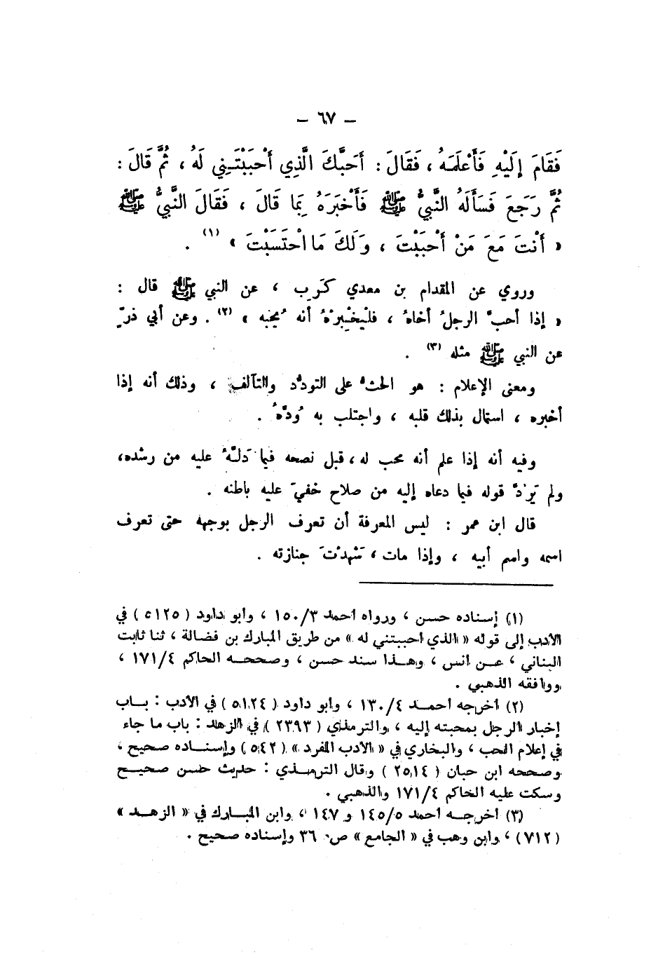 وَرُوِيَ عَنِ الْمِقْدَامِ بْنِ مَعْدِي كَرِبَ، عَنِ النَّبِيّ صَلَّى اللهُ عَلَيْهِ وَسَلَّمَ، قَالَ: «إِذَا أَحَبَّ الرَّجُلُ أَخَاهُ، فَلْيُخْبِرْهُ أَنَّهُ يُحِبُّهُ».