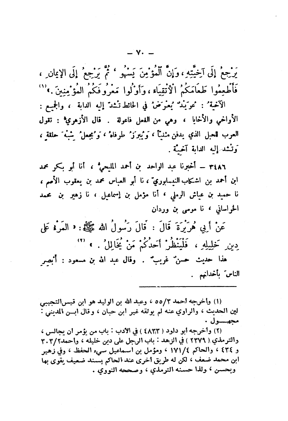 3486 - أَخْبَرَنَا عَبْدُ الْوَاحِدِ بْنُ أَحْمَدَ الْمَلِيحِيُّ، أَنا أَبُو بَكْرٍ مُحَمَّدُ بْنُ أَحْمَدَ بْنِ إِشْكَابٍ النَّيْسَابُورِيُّ، نَا أَبُو الْعَبَّاسِ مُحَمَّدُ بْنُ يَعْقُوبَ الأَصَمُّ، نَا حُمَيْدُ بْنُ عَيَّاشٍ الرَّمْلِيُّ، أَنا مُؤَمَّلُ بْنُ إِسْمَاعِيلَ، نَا زُهَيْرُ بْنُ مُحَمَّدٍ الْخُرَاسَانِيُّ، نَا مُوسَى بْنُ وَرْدَانَ، عَنْ أَبِي هُرَيْرَةَ، قَالَ: قَالَ رَسُولُ اللَّهِ صَلَّى اللهُ عَلَيْهِ وَسَلَّمَ: «الْمَرْءُ عَلَى دِينِ خَلِيلِهِ، فَلْيَنْظُرْ أَحَدُكُمْ مَنْ يُخَالِلُ».