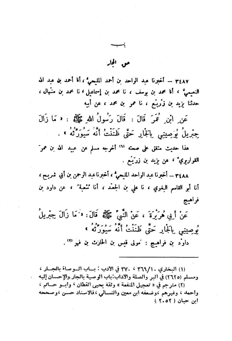 3488 - أَخْبَرَنَا عَبْدُ الْوَاحِدِ الْمَلِيحِيُّ، أَخْبَرَنَا عَبْدُ الرَّحْمَنِ بْنُ أَبِي شُرَيْحٍ، أَنا أَبُو الْقَاسِمِ الْبَغَوِيُّ، نَا عَلِيُّ بْنُ الْجَعْدِ، أَنا شُعْبَةُ، عَنْ دَاوُدَ بْنِ فَرَاهِيجَ، عَنْ أَبِي هُرَيْرَةَ، عَنِ النَّبِيِّ صَلَّى اللهُ عَلَيْهِ وَسَلَّمَ، قَالَ: «مَا زَالَ جِبْرِيلُ يُوصِينِي بِالْجَارِ حَتَّى ظَنَنْتُ أَنَّهُ سَيُوَرِّثُهُ»