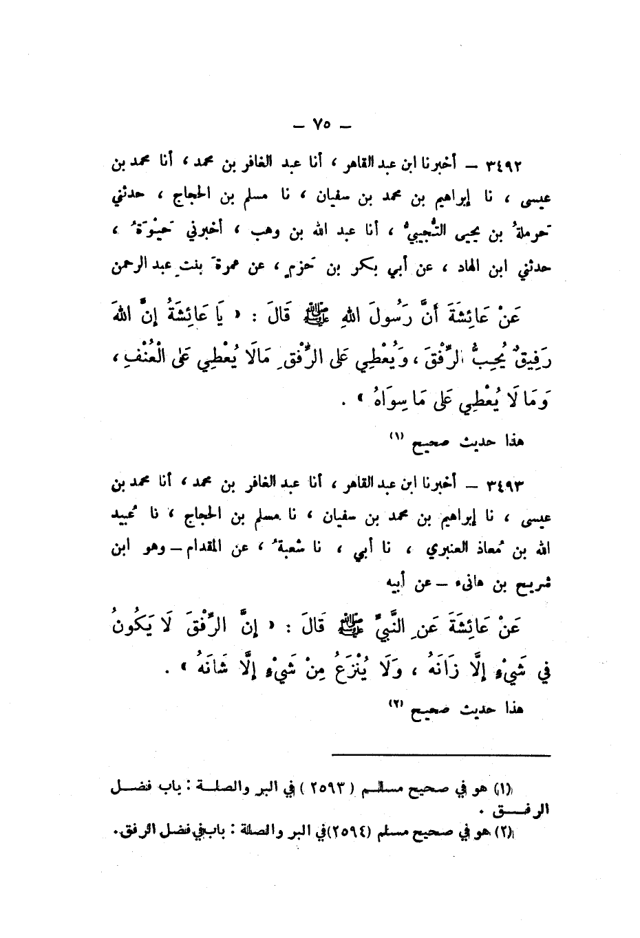 3492 - أَخْبَرَنَا ابْنُ عَبْدِ الْقَاهِرِ، أَنا عَبْدُ الْغَافِرِ بْنُ مُحَمَّدٍ، أَنا مُحَمَّدُ بْنُ عِيسَى، نَا إِبْرَاهِيمُ بْنُ مُحَمَّدِ بْنِ سُفْيَانَ، نَا مُسْلِمُ بْنُ الْحَجَّاجِ، حَدَّثَنِي حَرْمَلَةُ بْنُ يَحْيَى التُّجِيبِيُّ، أَنا عَبْدُ اللَّهِ بْنُ وَهْبٍ، أَخْبَرَنِي حَيْوَةُ، حَدَّثَنِي ابْنُ الْهَادِ، عَنْ أَبِي بَكْرِ بْنِ حَزْمٍ، عَنْ عَمْرَةَ بِنْتِ عَبْدِ الرَّحْمَنِ، عَنْ عَائِشَةَ، أَنّ رَسُولَ اللَّهِ صَلَّى اللهُ عَلَيْهِ وَسَلَّمَ، قَالَ: «يَا عَائِشَةَ، إِنَّ اللَّهَ رَفِيقٌ يُحِبُّ الرِّفْقَ، وَيُعْطِي عَلَى الرِّفْقِ مَا لَا يُعْطِي عَلَى الْعُنْفِ، وَمَا لَا يُعْطِي عَلَى مَا سِوَاهُ».