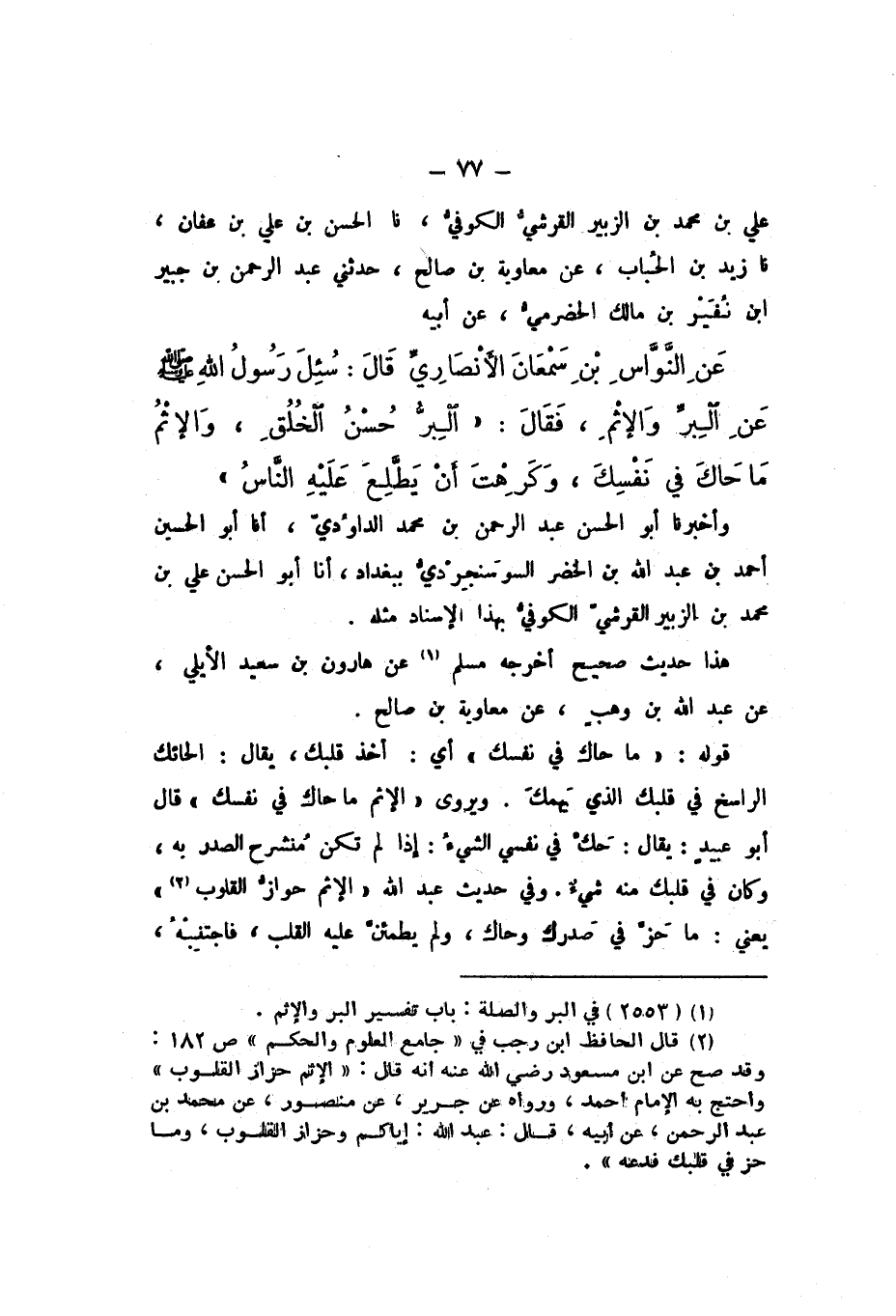 عَلِيُّ بْنُ مُحَمَّدِ بْنِ الزُّبَيْرِ الْقُرَشِيُّ الْكُوفِيُّ، نَا الْحَسَنُ بْنُ عَلِيِّ بْنِ عَفَّانَ، نَا زَيْدُ بْنُ الْحُبَابِ، عَنْ مُعَاوِيَةَ بْنِ صَالِحٍ، حَدَّثَنِي عَبْدُ الرَّحْمَنِ بْنُ جُبَيْرِ بْنِ نُفَيْرِ بْنِ مَالِكٍ الْحَضْرَمِيُّ، عَنْ أَبِيهِ، عَنِ النَّوَّاسِ بْنِ سَمْعَانَ الأَنْصَارِيِّ، قَالَ: " سُئِلَ رَسُولُ اللَّهِ صَلَّى اللهُ عَلَيْهِ وَسَلَّمَ عَنِ الْبِرِّ وَالإِثْمِ، فَقَالَ: الْبِرُّ حُسْنُ الْخُلُقِ، وَالإِثْمُ مَا حَاكَ فِي نَفْسِكَ، وَكَرِهْتَ أَنْ يَطَّلِعَ عَلَيْهِ النَّاسُ ".