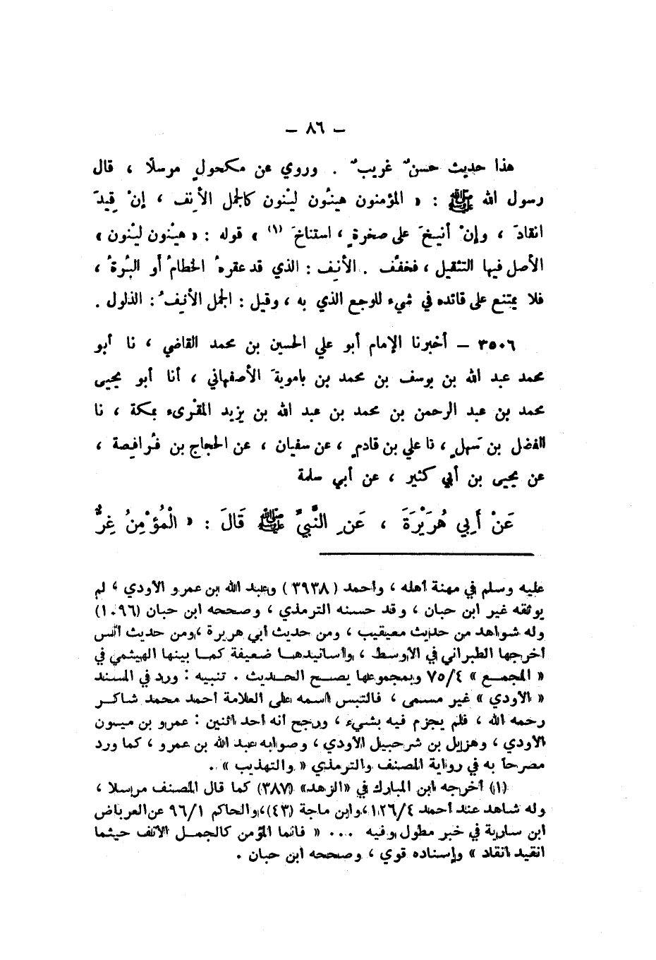 وَرُوِيَ عَنْ مَكْحُولٍ، مُرْسَلا، قَالَرَسُولُ اللَّهِ صَلَّى اللهُ عَلَيْهِ وَسَلَّمَ: «الْمُؤْمِنُونَ هَيِّنُونَ لَيِّنُونَ كَالْجَمَلِ الأَنِفِ، إِنْ قِيدَ انْقَادَ، وَإِنْ أُنِيخَ عَلَى صَخْرَةٍ اسْتَنَاخَ» قَوْله: «هَينُونَ لَينُونَ»، الأَصْل فِيهَا التثقيل، فَخفف.