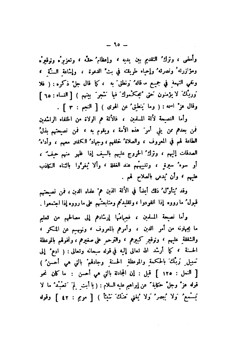 وَأما نصيحة الْمُسلمين، فجماعها إرشادهم إِلَى مصالحهم مِن تَعْلِيم مَا يجهلونه مِن أَمر الدّين، وَأمرهمْ بِالْمَعْرُوفِ، ونهيهم عَن الْمُنكر، والشفقة عَلَيْهِم، وتوقير كَبِيرهمْ، والترحم عَلَى صَغِيرهمْ، وتخولهم بِالْمَوْعِظَةِ الْحَسَنَة، كَمَا أرشد اللَّه تَعَالَى إِلَيْهِ فِي قَوْله سُبْحَانَهُ وَتَعَالَى: {ادْعُ إِلَى سَبِيلِ رَبِّكَ بِالْحِكْمَةِ وَالْمَوْعِظَةِ الْحَسَنَةِ وَجَادِلْهُمْ بِالَّتِي هِيَ أَحْسَنُ} [النَّحْل: 125]، قِيلَ: إِن المجادلة بِالَّتِي هِيَ أحسن: مَا كَانَ نَحْو قَوْله عز وَجل حِكَايَة عَن إِبْرَاهِيم عَلَيْهِ السَّلَام: {يَا أَبَتِ لِمَ تَعْبُدُ مَا لَا يَسْمَعُ وَلا يُبْصِرُ وَلا يُغْنِي عَنْكَ شَيْئًا} [مَرْيَم: 42]، وَقَوله