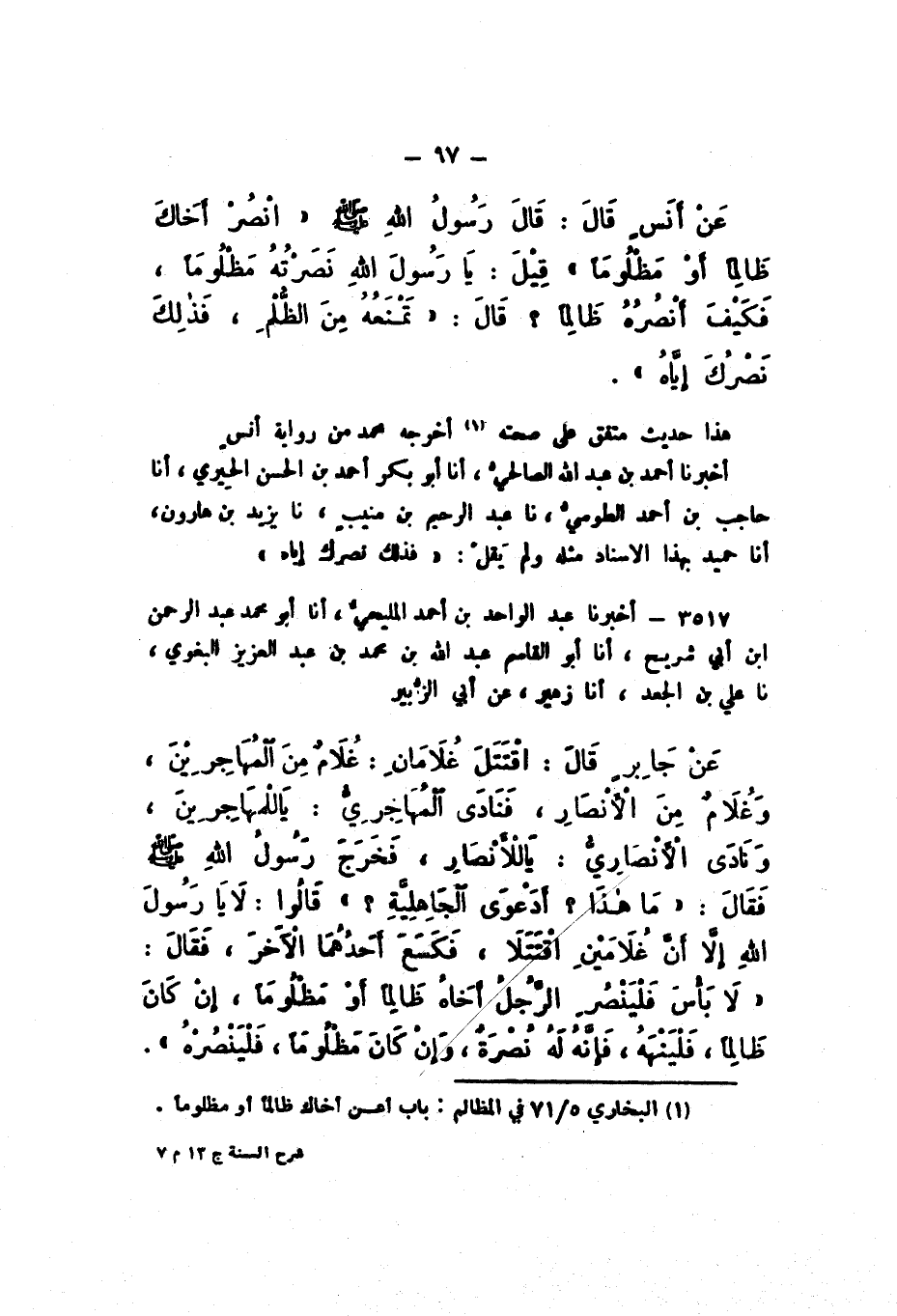 عَنْ أَنَسٍِ، قَالَ: قَالَ رَسُولُ اللَّهِ صَلَّى اللهُ عَلَيْهِ وَسَلَّمَ: " انْصُرْ أَخَاكَ ظَالِمًا أَوْ مَظْلُومًا، قِيلَ: يَا رَسُولَ اللَّهِ نَصَرْتُهُ مَظًلُومًا، فَكَيْفَ أَنْصُرُهُ ظَالِمًا؟ قَالَ: تَمْنَعُهُ مِنَ الظُّلْمِ، فَذَلِكَ نَصْرُكَ إِيَّاهُ "
