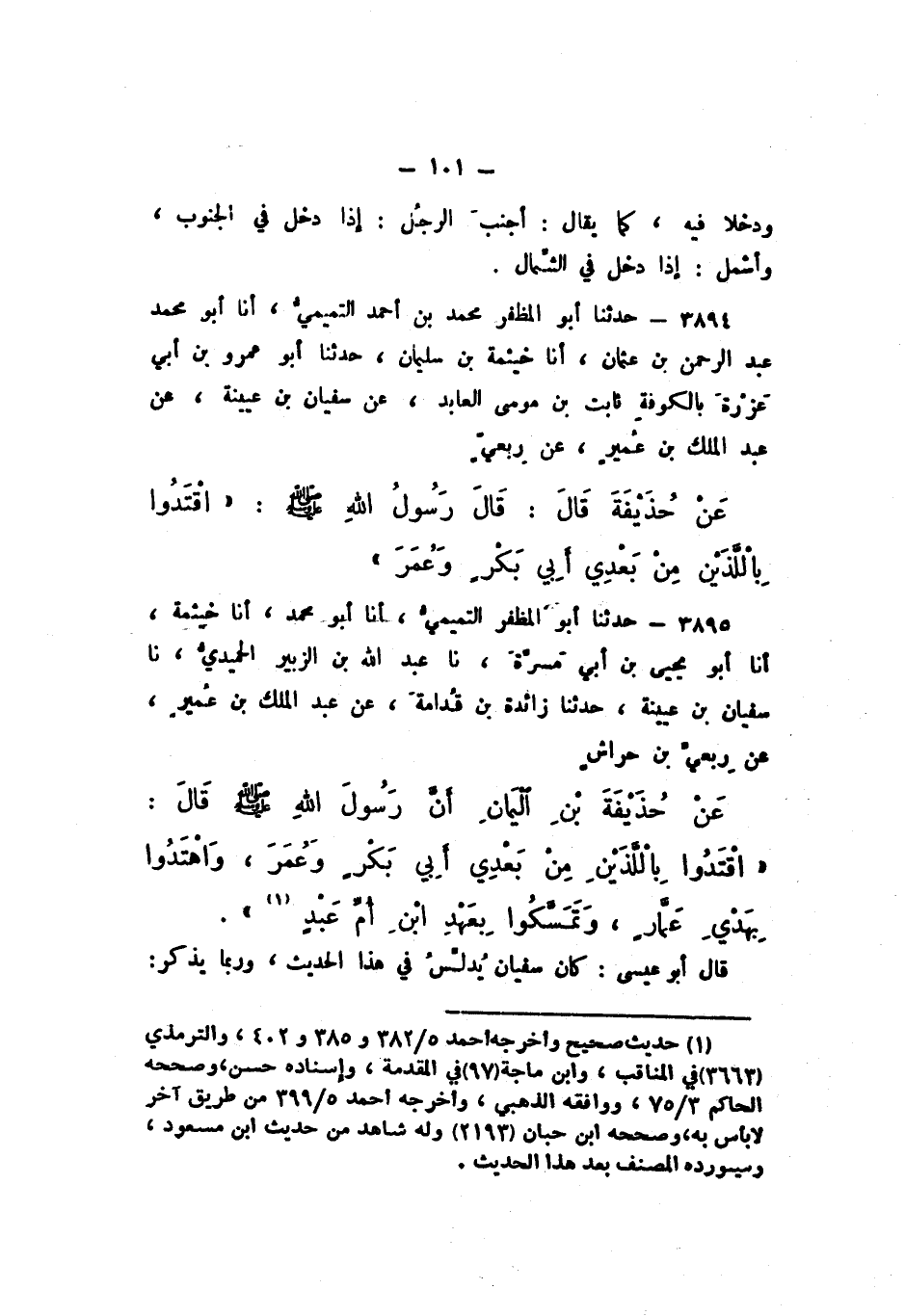 3895 - حَدَّثَنَا أَبُو الْمُظَفَّرِ مُحَمَّدُ بْنُ أَحْمَدَ التَّمِيمِيُّ، أَنَا أَبُو مُحَمَّدٍ عَبْدُ الرَّحْمَنِ بْنُ عُثْمَانَ، أَنَا خَيْثَمَةُ بْنُ سُلَيْمَانَ، حَدَّثَنَا أَبُو عَمْرِو بْنُ أَبِي عَزْرَةَ بِالْكُوفَةِ، عَنْ ثَابِتِ بْنِ مُوسَى الْعَابِدِ، عَنْ سُفْيَانَ بْنِ عُيَيْنَةَ، عَنْ عَبْدِ الْمَلِكِ بْنِ عُمَيْرٍ، عَنْ رِبْعِيٍّ، عَنْ حُذَيْفَةَ، قَالَ: قَالَ رَسُولُ اللَّهِ صَلَّى اللهُ عَلَيْهِ وَسَلَّمَ: «اقْتَدُوا بِاللَّذَيْنِ مِنْ بَعْدِي أَبِي بَكْرٍ، وَعُمَرَ»
