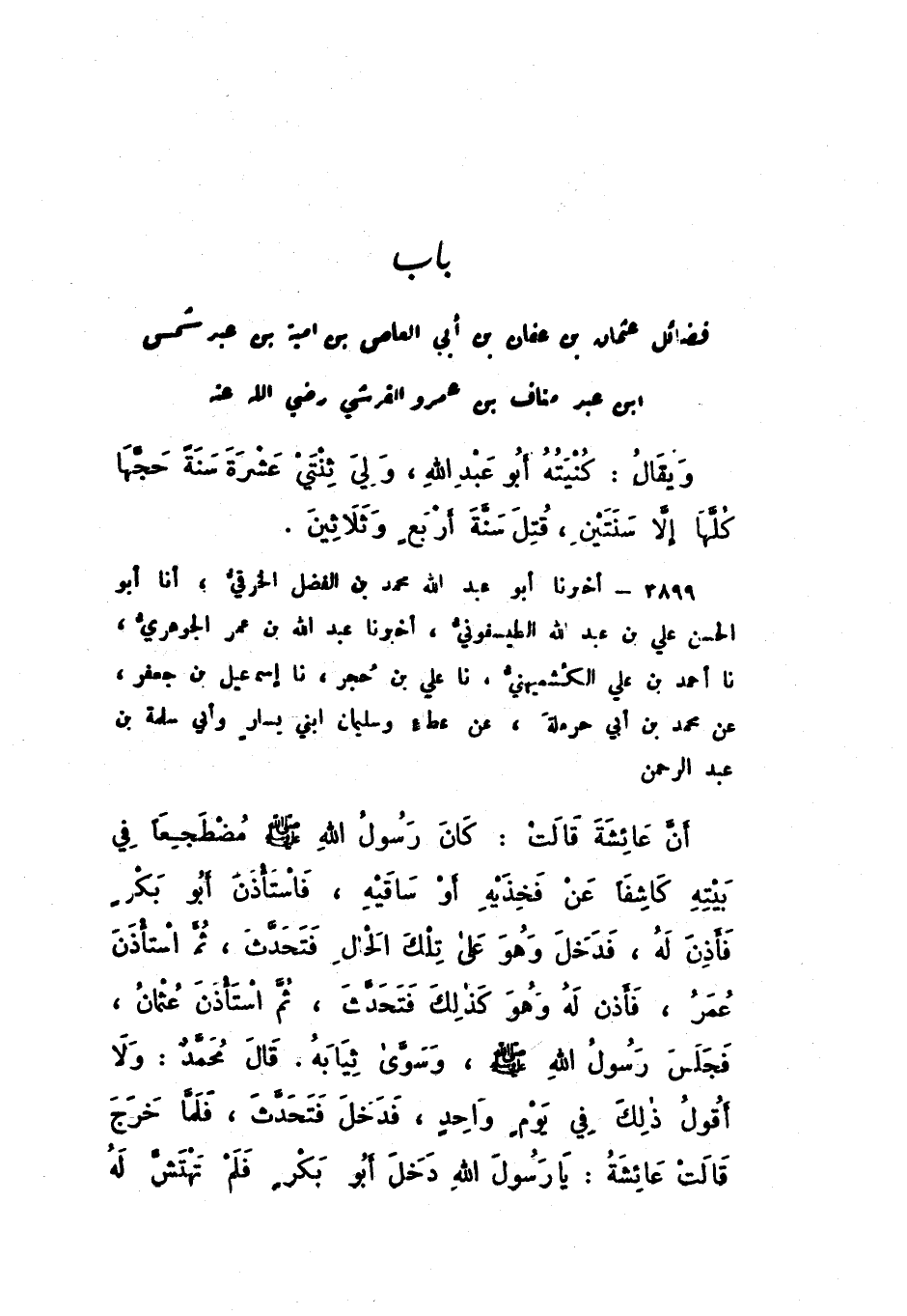 3899 - أَخْبَرَنَا أَبُو عَبْدِ اللَّهِ مُحَمَّدُ بْنُ الْفَضْلِ الْخِرَقِيُّ، أَنَا أَبُو الْحَسَنِ عَلِيُّ بْنُ عَبْدِ اللَّهِ الطَّيْسَفُونِيُّ، أَخْبَرَنَا عَبْدُ اللَّهِ بْنُ عُمَرَ الْجَوْهَرِيُّ، نَا أَحْمَدُ بْنُ عَلِيٍّ الْكُشْمِيهَنِيُّ، نَا عَلِيُّ بْنُ حُجْرٍ، نَا إِسْمَاعِيلُ بْنُ جَعْفَرٍ، عَنْ مُحَمَّدِ بْنِ أَبِي حَرْمَلَةَ، عَنْ عَطَاءٍ، وَسُلَيْمَانَ ابْنَيْ يَسَارٍ، وَأَبِي سَلَمَةَ بْنِ عَبْدِ الرَّحْمَنِ، أَنَّ عَائِشَةَ، قَالَتْ: كَانَ رَسُولُ اللَّهِ صَلَّى اللهُ عَلَيْهِ وَسَلَّمَ مُضْطَجِعًا فِي بَيْتِهِ كَاشِفًا عَنْ فَخِذَيْهِ أَوْ سَاقَيْهِ، فَاسْتَأْذَنَ أَبُو بَكْرٍ فَأَذِنَ لَهُ، فَدَخَلَ وَهُوَ عَلَى تِلْكَ الْحَالِ فَتَحَدَّثَ، ثُمَّ اسْتَأْذَنَ عُمَرَ، فَأَذِنَ لَهُ وَهُوَ كَذَلِكَ فَتَحَدَّثَ، ثُمَّ اسْتَأْذَنَ عُثْمَانَ، فَجَلَسَ رَسُولُ اللَّهِ صَلَّى اللهُ عَلَيْهِ وَسَلَّمَ وَسَوَّى ثِيَابَهُ، قَالَ مُحَمَّدٌ: وَلا أَقُولُ ذَلِكَ فِي يَوْمٍ وَاحِدٍ، فَدَخَلَ فَتَحَدَّثَ، فَلَمَّا خَرَجَ، قَالَتْ عَائِشَةُ: يَا رَسُولَ اللَّهِ، دَخَلَ أَبُو بَكْرٍ فَلَمْ تَهْتَشَّ لَهُ