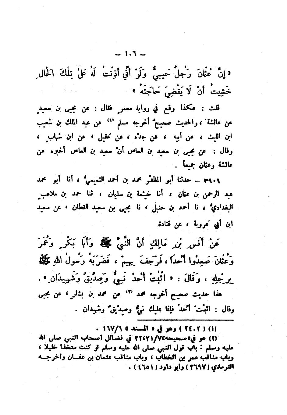 3901 - حَدَّثَنَا أَبُو الْمُظَفَّرِ مُحَمَّدُ بْنُ أَحْمَدَ التَّمِيمِيُّ، أَنَا أَبُو مُحَمَّدٍ عَبْدُ الرَّحْمَنِ بْنُ عُثْمَانَ، أَنَا خَيْثَمَةُ بْنُ سُلَيْمَانَ، ثَنَا حَمْدُ بْنُ مُلاعِبٍ الْبَغْدَادِيُّ , نَا أَحْمَدُ بْنُ حَنْبَلٍ، نَا يَحْيَى بْنُ سَعِيدٍ الْقَطَّانُ، عَنْ سَعِيدِ بْنِ أَبِي عَرُوبَةَ، عَنْ قَتَادَةَ، عَنْ أَنَسِ بْنِ مَالِكٍ، أَنَّ النَّبِيَّ صَلَّى اللهُ عَلَيْهِ وَسَلَّمَ وَأَبَا بَكْرٍ، وَعُمَرَ، وَعُثْمَانَ صَعِدُوا أُحُدًا، فَرَجَفَ بِهِمْ، فَضَرَبَهُ رَسُولُ اللَّهِ صَلَّى اللهُ عَلَيْهِ وَسَلَّمَ بِرِجْلِهِ، وَقَالَ: «اثْبُتْ أُحُدُ نَبِيٌّ وَصِدِّيقٌ وَشَهِيدَانِ» , هَذَا حَدِيثٌ صَحِيحٌ أَخْرَجَهُ مُحَمَّدٌ، عَنْ مُحَمَّدِ بْنِ بَشَّارٍ، عَنْ يَحْيَى، وَقَالَ: «اثْبُتْ أُحُدُ، فَإِنَّمَا عَلَيْكَ نَبِيٌّ وَصِدِّيقٌ وَشَهِيدَانِ»