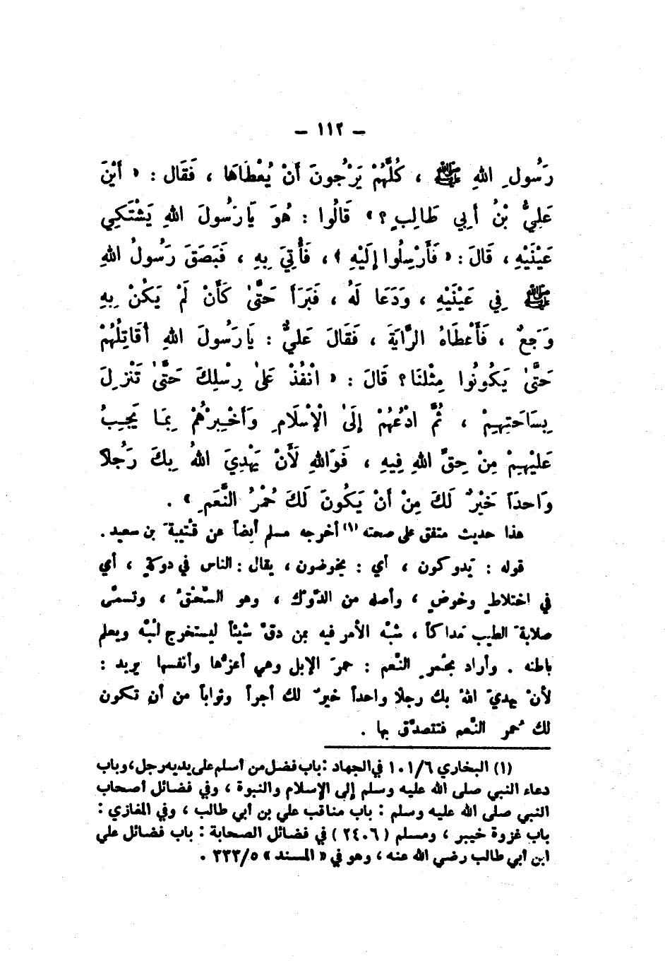 رَسُولِ اللَّهِ صَلَّى اللهُ عَلَيْهِ وَسَلَّمَ كُلُّهُمْ يَرْجُو أَنْ يُعْطَاهَا، فَقَالَ: «أَيْنَ عَلِيُّ بْنُ أَبِي طَالِبٍ؟» قَالُوا: هُوَ يَا رَسُولَ اللَّهِ يَشْتَكِي عَيْنَيْهِ، قَالَ: «فَأَرْسِلُوا إِلَيْهِ»، فَأُتِيَ بِهِ، فَبَصَقَ رَسُولُ اللَّهِ صَلَّى اللهُ عَلَيْهِ وَسَلَّمَ فِي عَيْنَيْهِ، وَدَعَا لَهُ، فَبَرَأَ حَتَّى كَأَنْ لَمْ يَكُنْ بِهِ وَجَعٌ فَأَعْطَاهُ الرَّايَةَ، فَقَالَ عَلِيٌّ: يَا رَسُولَ اللَّهِ، أُقَاتِلُهُمْ حَتَّى يَكُونُوا مِثْلَنَا؟ قَالَ: «انْفُذْ عَلَى رِسْلِكَ حَتَّى تَنْزِلَ بِسَاحَتِهِمْ، ثُمَّ ادْعُهُمْ إِلَى الإِسْلامِ، وَأَخْبِرْهُمْ بِمَا يَجِبُ عَلَيْهِمْ مِنْ حَقِّ اللَّهِ فِيهِ، فَوَاللَّهِ لأَنْ يَهْدِيَ اللَّهُ بِكَ رَجُلا وَاحِدًا خَيْرٌ لَكَ مِنْ أَنْ يَكُونَ لَكَ حُمْرُ النَّعَمِ».