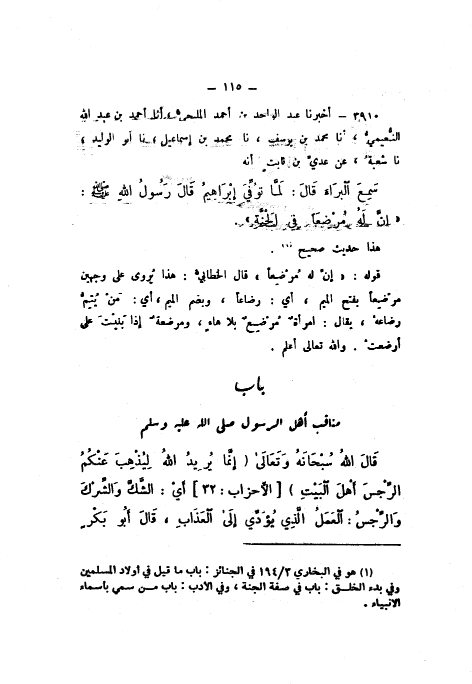 3910 - أَخْبَرَنَا عَبْدُ الْوَاحِدِ بْنُ أَحْمَدَ الْمَلِيحِيُّ، أَنَا أَحْمَدُ بْنُ عَبْدِ اللَّهِ النُّعَيْمِيُّ، أَنَا مُحَمَّدُ بْنُ يُوسُفَ، نَا مُحَمَّدُ بْنُ إِسْمَاعِيلَ , نَا أَبُو الْوَلِيدِ، نَا شُعْبَةُ، عَنْ عَدِيِّ بْنِ ثَابِتٍ، أَنَّهُ سَمِعَ الْبَرَاءَ، قَالَ: لَمَّا تُوُفِّيَ إِبْرَاهِيمُ، قَالَ رَسُولُ اللَّهِ صَلَّى اللهُ عَلَيْهِ وَسَلَّمَ: «إِنَّ لَهُ مُرْضِعًا فِي الْجَنَّةِ».