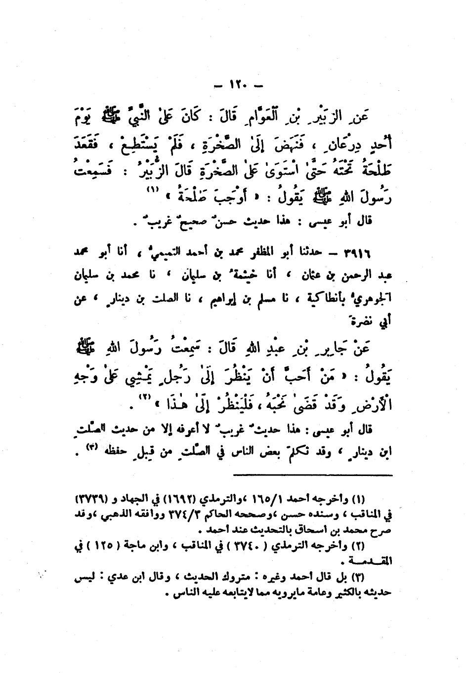 عَنِ الزُّبَيْرِ بْنِ الْعَوَّامِ، قَالَ: كَانَ عَلَى النَّبِيِّ صَلَّى اللهُ عَلَيْهِ وَسَلَّمَ يَوْمَ أُحُدٍ دِرْعَانِ، فَنَهَضَ إِلَى الصَّخْرَةِ، فَلَمْ يَسْتَطِعْ، فَقَعَدَ طَلْحَةُ تَحْتَهُ حَتَّى اسْتَوَى عَلَى الصَّخْرَةِ، قَالَ الزُّبَيْرُ: فَسَمِعْتُ رَسُولَ اللَّهِ صَلَّى اللهُ عَلَيْهِ وَسَلَّمَ يَقُولُ: «أَوْجَبَ طَلْحَةُ».