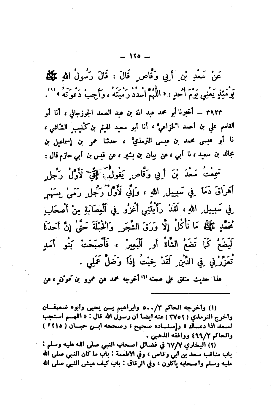 3923 - أَخْبَرَنَا أَبُو مُحَمَّدٍ عَبْدُ اللَّهِ بْنُ عَبْدِ الصَّمَدِ الْجَوْزَجَانِيُّ، أَنَا أَبُو الْقَاسِمِ عَلِيُّ بْنُ أَحْمَدَ الْخُزَاعِيُّ، أَنَا أَبُو سَعِيدٍ الْهَيْثَمُ بْنُ كُلَيْبٍ الشَّاشِيُّ، نَا أَبُو عِيسَى مُحَمَّدُ بْنُ عِيسَى التِّرْمِذِيُّ، حَدَّثَنَا عُمَرُ بْنُ إِسْمَاعِيلَ بْنِ مُجَالِدِ بْنِ سَعِيدٍ، نَا أَبِي، عَنْ بَيَانِ بْنِ بَشِيرٍ، عَنْ قَيْسِ بْنِ أَبِي حَازِمٍ، قَالَ: سَمِعْتُ سَعْدَ بْنَ أَبِي وَقَّاصٍ، يَقُولُ: «إِنِّي لأَوَّلُ رَجُلٍ أَهْرَاقَ دَمًا فِي سَبِيلِ اللَّهِ، وَإِنِّي لأَوَّلُ رَجُلٍ رَمَى بِسَهْمٍ فِي سَبِيلِ اللَّهِ، لَقَدْ رَأَيْتُنِي أَغْزُو فِي الْعِصَابَةِ مِنْ أَصْحَابِ مُحَمَّدٍ صَلَّى اللهُ عَلَيْهِ وَسَلَّمَ مَا نَأْكُلُ إِلا وَرَقَ الشَّجَرِ وَالْحُبْلَةَ حَتَّى إِنَّ أَحَدَنَا لَيَضَعُ كَمَا تَضَعُ الشَّاةُ أَوِ الْبَعِيرُ، فَأَصْبَحَتْ بَنُو أَسَدٍ تُعَزِّرُنِي فِي الدِّينِ لَقَدْ خِبْتُ إِذًا وَضَلَّ عَمَلِي».