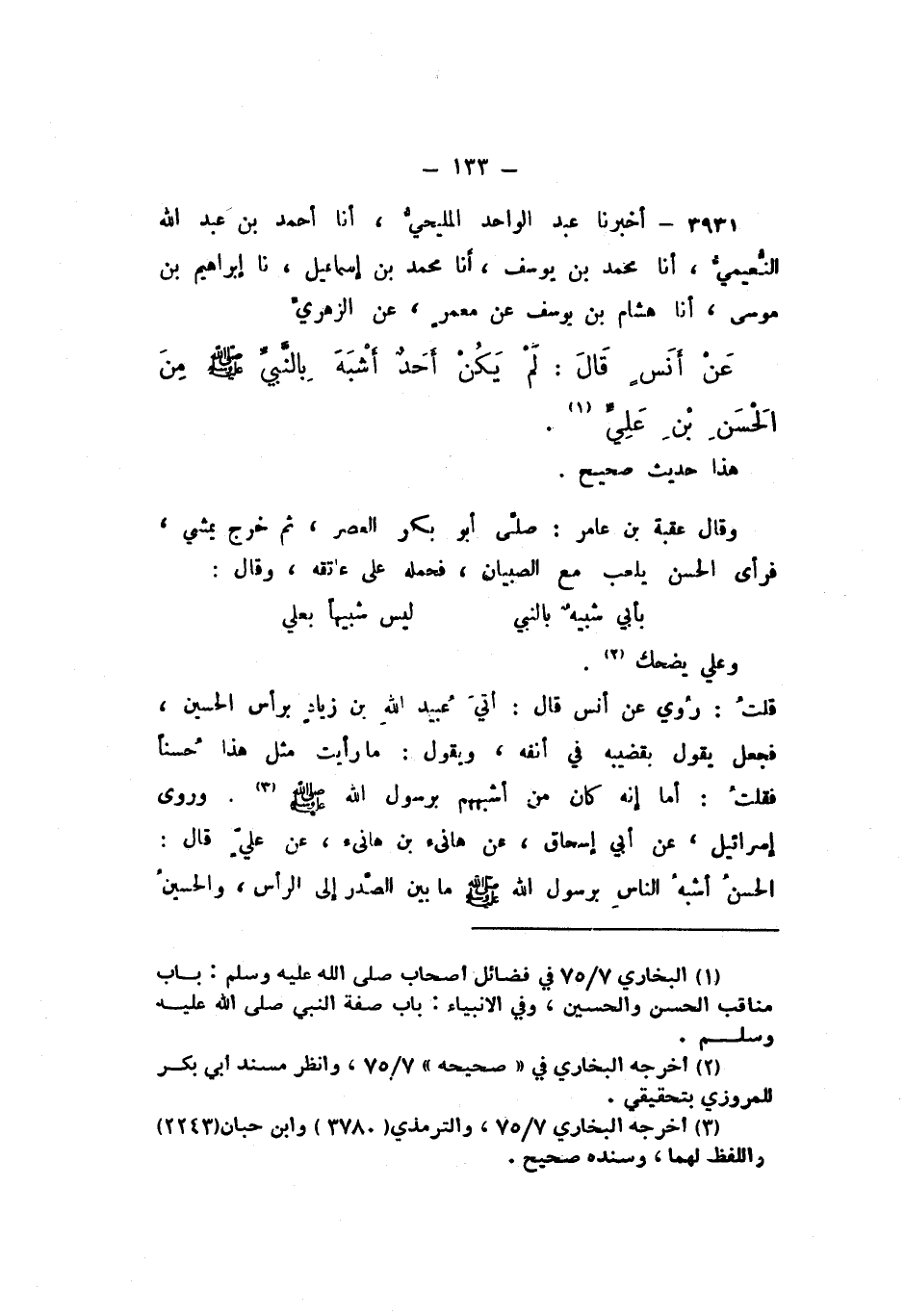 3931 - أَخْبَرَنَا عَبْدُ الْوَاحِدِ الْمَلِيحِيُّ، أَنَا أَحْمَدُ بْنُ عَبْدِ اللَّهِ النُّعَيْمِيُّ، أَنَا مُحَمَّدُ بْنُ يُوسُفَ، أَنَا مُحَمَّدُ بْنُ إِسْمَاعِيلَ، نَا إِبْرَاهِيمُ بْنُ مُوسَى، أَنَا هِشَامُ بْنُ يُوسُفَ، عَنْ مَعْمَرٍ، عَنِ الزُّهْرِيِّ، عَنْ أَنَسٍ، قَالَ: «لَمْ يَكُنْ أَحَدٌ أَشْبَهُ بِالنَّبِيِّ صَلَّى اللهُ عَلَيْهِ وَسَلَّمَ مِنَ الْحَسَنِ بْنِ عَلِيٍّ».