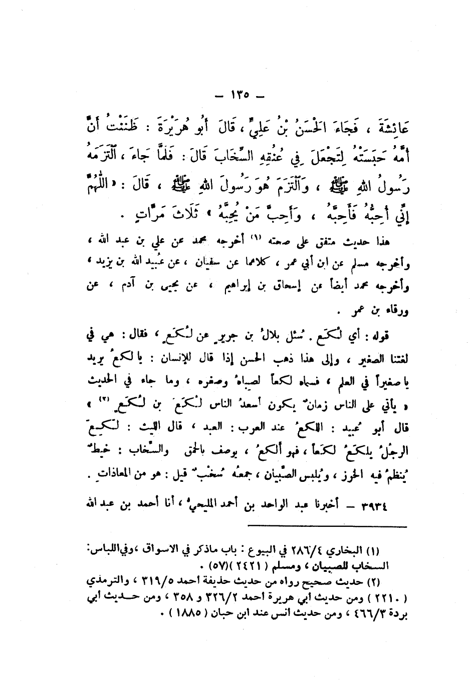 عَائِشَةَ، فَجَاءَ الْحَسَنُ بْنُ عَلِيٍّ، قَالَ أَبُو هُرَيْرَةَ: ظَنَنْتُ أَنَّ أُمَّهُ حَبَسَتْهُ لِتَجْعَلَ فِي عُنُقِهِ السِّخَابَ، قَالَ: فَلَمَّا جَاءَ الْتَزَمَهُ رَسُولُ اللَّهِ صَلَّى اللهُ عَلَيْهِ وَسَلَّمَ وَالْتَزَمَ هُوَ رَسُولَ اللَّهِ صَلَّى اللهُ عَلَيْهِ وَسَلَّمَ قَالَ: «اللَّهُمَّ إِنِّي أُحِبُّهُ فَأَحِبَّهُ، وَأَحِبَّ مَنْ يُحِبَّهُ»، ثَلاثَ مَرَّاتٍ.