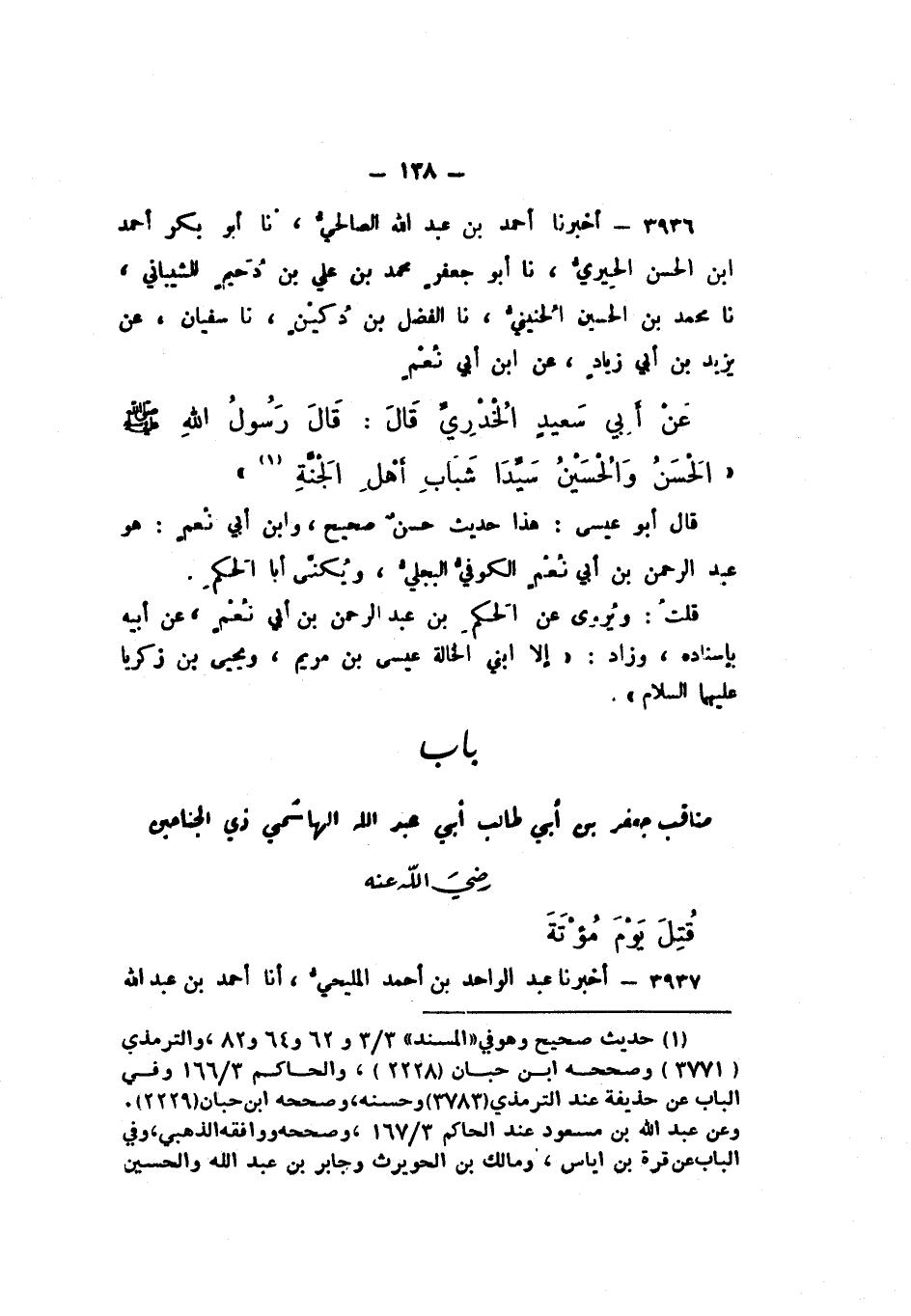 3936 - أَخْبَرَنَا أَحْمَدُ بْنُ عَبْدِ اللَّهِ الصَّالِحِيُّ، نَا أَبُو بَكْرٍ أَحْمَدُ بْنُ الْحَسَنِ الْحِيرِيُّ، نَا أَبُو جَعْفَرٍ مُحَمَّدُ بْنُ عَلِيِّ بْنِ دُحَيْمٍ الشَّيْبَانِيُّ، نَا مُحَمَّدُ بْنُ الْحُسَيْنِ الْحُنَيْنِيُّ، نَا الْفَضْلُ بْنُ دُكَيْنٍ، نَا سُفْيَانُ، عَنْ يَزِيدَ بْنِ أَبِي زِيَادٍ، عَنِ ابْنِ أَبِي نُعْمٍ، عَنْ أَبِي سَعِيدٍ الْخُدْرِيِّ، قَالَ: قَالَ رَسُولُ اللَّهِ صَلَّى اللهُ عَلَيْهِ وَسَلَّمَ: «الْحَسَنُ وَالْحُسَيْنُ سَيِّدَا شَبَابِ أَهْلِ الْجَنَّةِ».