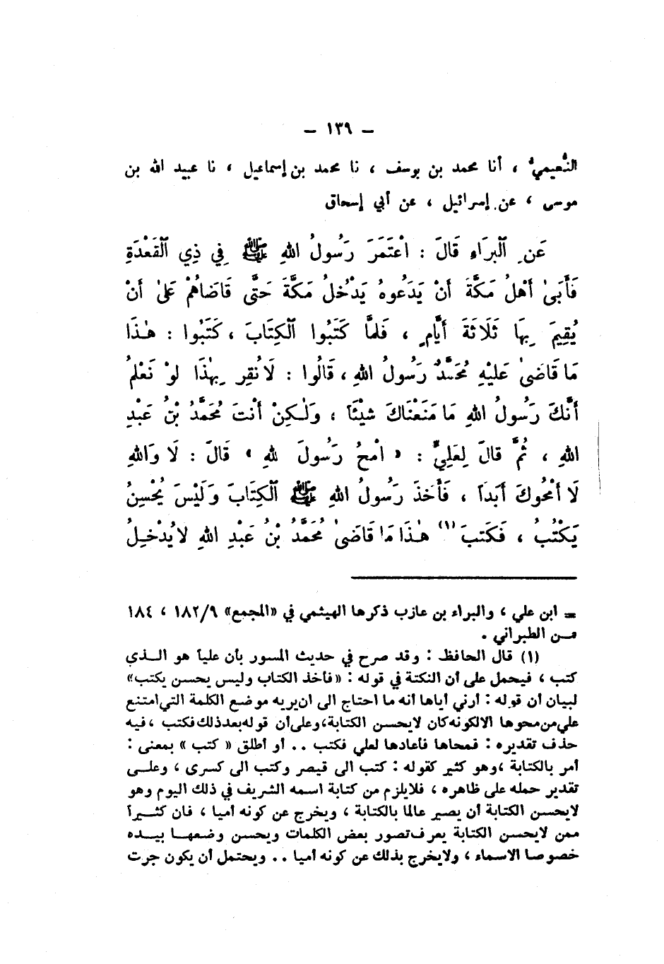 النُّعَيْمِيُّ، أَنَا مُحَمَّدُ بْنُ يُوسُفَ، نَا مُحَمَّدُ بْنُ إِسْمَاعِيلَ، نَا عُبَيْدُ اللَّهِ بْنُ مُوسَى، عَنْ إِسْرَائِيلَ، عَنْ أَبِي إِسْحَاقَ، عَنِ الْبَرَاءِ، قَالَ: اعْتَمَرَ رَسُولُ اللَّهِ صَلَّى اللهُ عَلَيْهِ وَسَلَّمَ فِي ذِي الْقَعْدَةِ، فَأَبَى أَهْلُ مَكَّةَ أَنْ يَدَعُوهُ يَدْخُلُ مَكَّةَ حَتَّى قَاضَاهُمْ عَلَى أَنْ يُقِيمَ بِهَا ثَلاثَةَ أَيَّامٍ، فَلَمَّا كَتَبُوا الْكِتَابَ، كَتَبُوا: هَذَا مَا قَاضَى عَلَيْهِ مُحَمَّدٌ رَسُولُ اللَّهِ، قَالُوا: لَا نُقِرُّ بِهَذَا، لَوْ نَعْلَمُ أَنَّكَ رَسُولُ اللَّهِ مَا مَنَعْنَاكَ شَيْئًا، وَلَكِنْ أَنْتَ مُحَمَّدُ بْنُ عَبْدِ اللَّهِ، ثُمَّ قَالَ لِعَلِيٍّ: «امْحُ رَسُولَ اللَّهِ»، قَالَ: لَا وَاللَّهِ لَا أَمْحُوكَ أَبَدًا، فَأَخَذَ رَسُولُ اللَّهِ صَلَّى اللهُ عَلَيْهِ وَسَلَّمَ الْكِتَابَ وَلَيْسَ يُحْسِنُ يَكْتُبُ، فَكَتَبَ: «هَذَا مَا قَاضَى مُحَمَّدُ بْنُ عَبْدِ اللَّهِ لَا يُدْخِلَ