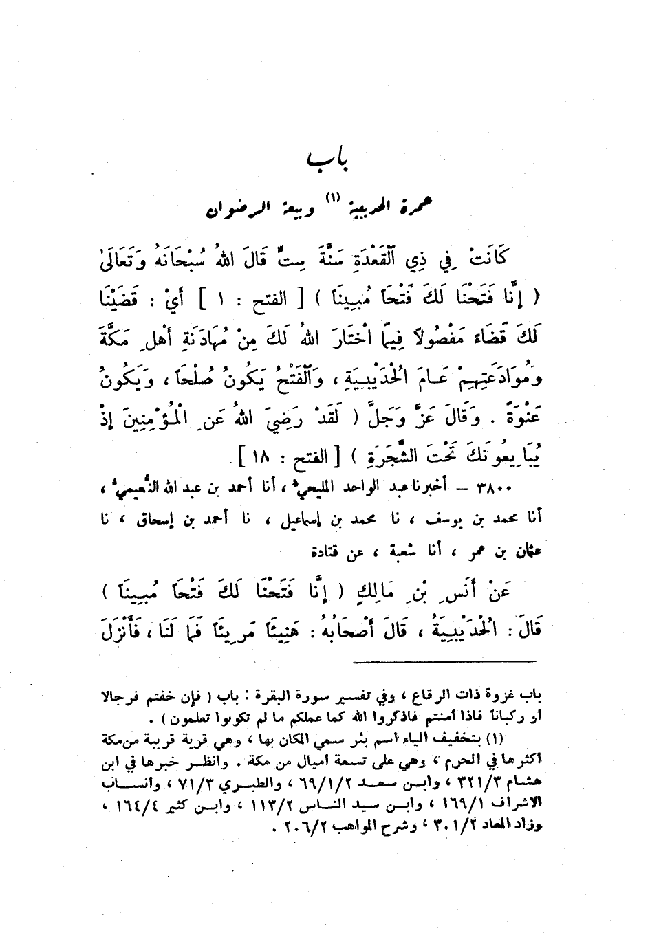 3800 - أَخْبَرَنَا عَبْدُ الْوَاحِدِ الْمَلِيحِيُّ، أَنَا أَحْمَدُ بْنُ عَبْدِ اللَّهِ النُّعَيْمِيُّ، أَنَا مُحَمَّدُ بْنُ يُوسُفَ، نَا مُحَمَّدُ بْنُ إِسْمَاعِيلَ، نَا أَحْمَدُ بْنُ إِسْحَاقَ، نَا عُثْمَانُ بْنُ عُمَرَ، أَنَا شُعْبَةُ، عَنْ قَتَادَةَ، عَنْ أَنَسِ بْنِ مَالِكٍ: {إِنَّا فَتَحْنَا لَكَ فَتْحًا مُبِينًا} [الْفَتْح: 1]، قَالَ: الْحُدَيْبِيَةُ "، قَالَ أَصْحَابُهُ: هَنِيئًا مَرِيئًا فَمَا لَنَا، فَأَنْزَلَ