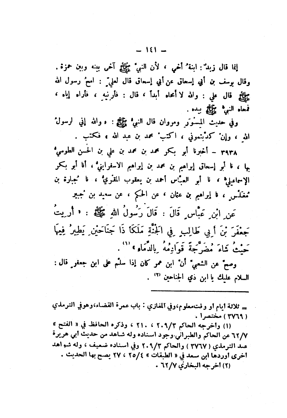 وَصَحَّ عَنِ الشَّعْبِيِّ أَنَّ ابْنَ عُمَرَ كَانَ إِذَا سَلَّمَ عَلَى ابْنِ جَعْفَرٍ، قَالَ: السَّلامُ عَلَيْكَ يَا ابْنَ ذِي الْجَنَاحَيْنِ
