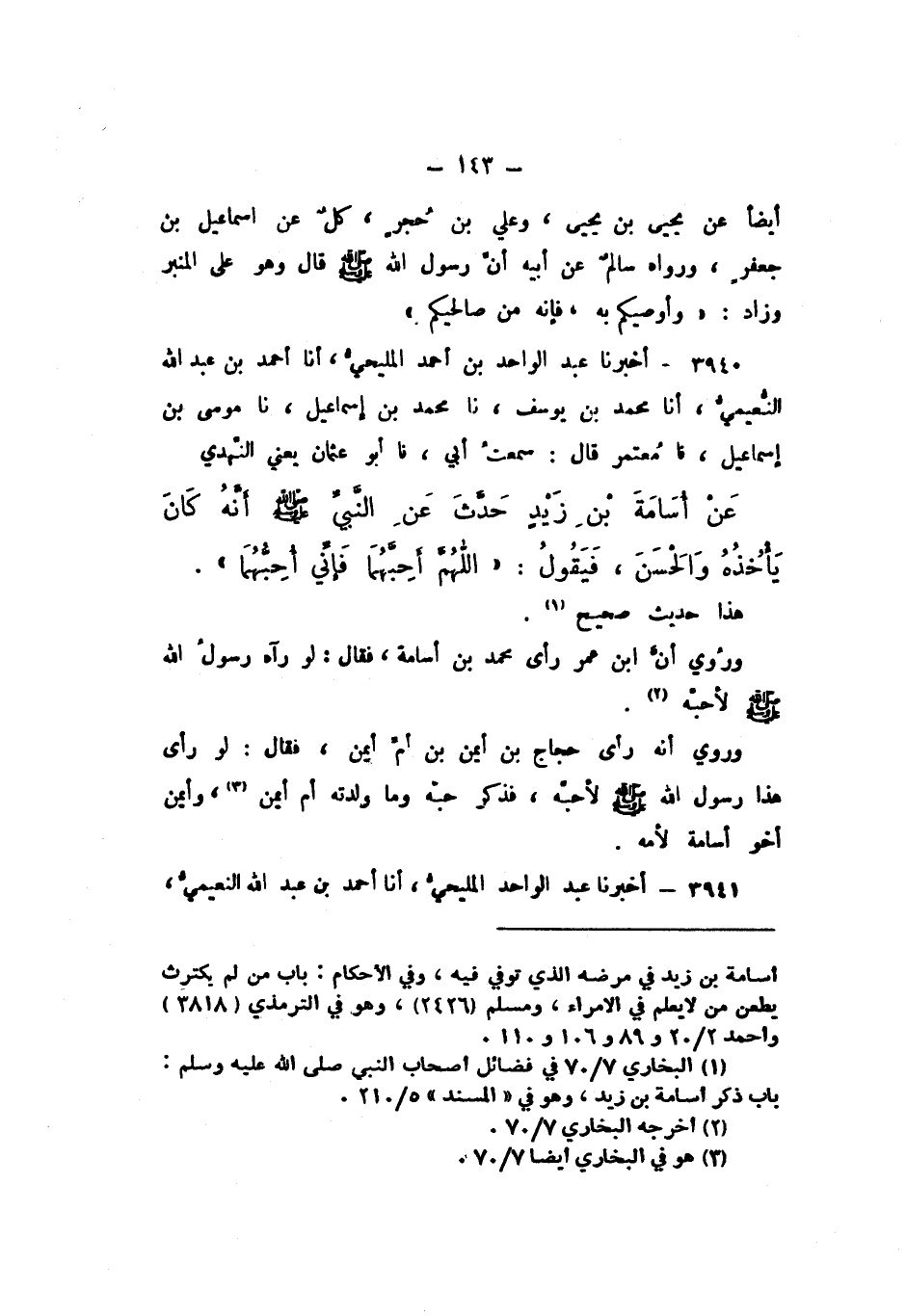 3940 - أَخْبَرَنَا عَبْدُ الْوَاحِدِ بْنُ أَحْمَدَ الْمَلِيحِيُّ، أَنَا أَحْمَدُ بْنُ عَبْدِ اللَّهِ النُّعَيْمِيُّ، أَنَا مُحَمَّدُ بْنُ يُوسُفَ، نَا مُحَمَّدُ بْنُ إِسْمَاعِيلَ، نَا مُوسَى بْنُ إِسْمَاعِيلَ، نَا مُعْتَمِرٌ، قَالَ: سَمِعْتُ أَبِي، نَا أَبُو عُثْمَانَ يَعْنِي النَّهْدِيَّ، عَنْ أُسَامَةَ بْنِ زَيْدٍ، حَدَّثَ عَنِ النَّبِيِّ صَلَّى اللهُ عَلَيْهِ وَسَلَّمَ أَنَّه كَانَ يَأْخُذُهُ وَالْحَسَنَ، فَيَقُولُ: «اللَّهُمَّ أَحِبَّهُمَا، فَإِنِّي أُحِبُّهُمَا».