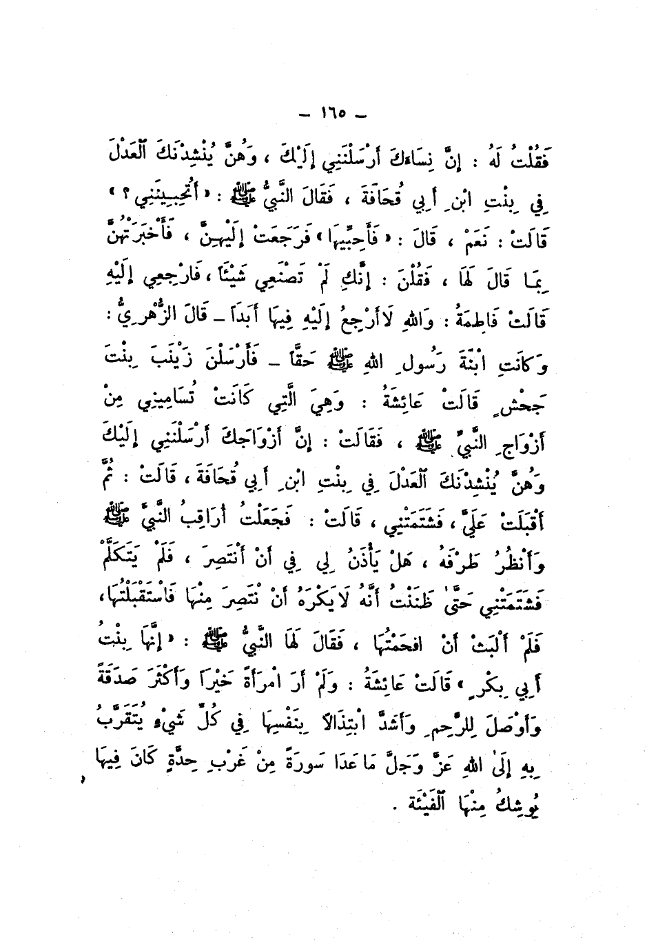 فَقُلْتُ لَهُ: إِنَّ نِسَاءَكَ أَرْسَلْنَنِي إِلَيْكَ، وَهُنَّ يَنْشُدْنَكَ الْعَدْل فِي بِنْتِ ابْنِ أَبِي قُحَافَةَ، فَقَالَ النَّبِيُّ صَلَّى اللهُ عَلَيْهِ وَسَلَّمَ: «أَتُحِبِّينَنِي؟» قَالَتْ: نَعَمْ، قَالَ: «فَأَحِبِّيهَا»، فَرَجَعْتُ إِلَيْهِنَّ، فَأَخْبَرْتُهُنَّ بِمَا قَالَ لَهَا، فَقُلْنَ: إِنَّكِ لَمْ تَصْنَعِي شَيْئًا، فَارْجِعِي إِلَيْهِ، قَالَتْ فَاطَمَةُ: وَاللَّهِ لَا أَرْجِعُ إِلَيْهِ فِيهَا أَبَدًا، قَالَ الزُّهْرِيُّ: وَكَانَتِ ابْنَةَ رَسُولِ اللَّهِ صَلَّى اللهُ عَلَيْهِ وَسَلَّمَ حَقًّا، فَأَرْسَلْنَ زَيْنَبَ بِنْتَ جَحْشٍ، قَالَتْ عَائِشَةُ: وَهِيَ الَّتِي كَانَتْ تُسَامِينِي مِنْ أَزْوَاجِ النَّبِيِّ صَلَّى اللهُ عَلَيْهِ وَسَلَّمَ فَقَالَتْ: إِنَّ أَزْوَاجَكَ أَرْسَلْنَنِي إِلَيْكَ وَهُنَّ يَنْشُدْنَكَ الْعَدْلَ فِي بِنْتِ ابْنِ أَبِي قُحَافَةَ، قَالَتْ: ثُمَّ أَقْبَلَتْ عَلَيَّ فَشَتَمَتْنِي، قَالَتْ: فَجَعَلْتُ أُرَاقِبُ النَّبِيَّ صَلَّى اللهُ عَلَيْهِ وَسَلَّمَ وَأَنْظُرُ طَرْفَه هَلْ يَأْذَنُ لِي فِي أَنْ أَنْتَصِرَ، فَلَمْ يَتَكَلَّمْ حَتَّى ظَنَنْتُ أَنَّهُ لَا يَكْرَهُ أَنْ أَنْتَصِرَ مِنْهَا فَاسْتَقْبَلُتَها، فَلَمْ أَلْبَثْ أَنْ أَفْحَمْتُهَا، فَقَالَ لَهَا النَّبِيُّ صَلَّى اللهُ عَلَيْهِ وَسَلَّمَ: «إِنَّهَا بِنْتُ أَبِي بَكْرٍ»، قَالَتْ عَائِشَةُ: وَلَمْ أَرَ امْرَأَةً خَيْرًا وَأَكْثَرَ صَدَقَةً وَأَوْصَلَ لِلرَّحِمِ وَأَشَدَّ ابْتِذَالا بِنَفْسِهَا فِي كُلِّ شَيْءٍ يُتَقَرَّبُ بِهِ إِلَى اللَّهِ عَزَّ وَجَلَّ، مَا عَدَا سَوْرَةً مِنْ غَرْبِ حِدَّةٍ كَانَ فِيهَا يُوشِكُ مِنْهَا الْفَيْئَةَ.