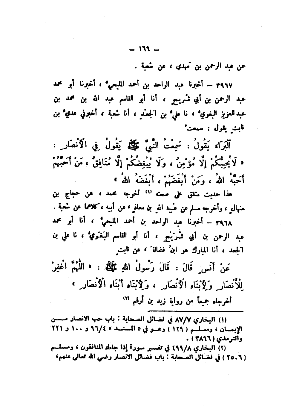 3967 - أَخْبَرَنَا عَبْدُ الْوَاحِدِ بْنُ أَحْمَدَ الْمَلِيحِيُّ، أَخْبَرَنَا أَبُو مُحَمَّدٍ عَبْدُ الرَّحْمَنِ بْنُ أَبِي شُرَيْحٍ، أَنَا أَبُو الْقَاسِمِ عَبْدُ اللَّهِ بْنُ مُحَمَّدِ بْنِ عَبْدِ الْعَزِيزِ الْبَغَوِيُّ، نَا عَلِيُّ بْنُ الْجَعْدِ، أَنَا شُعْبَةُ، أَخْبَرَنِي عَدِيُّ بْنُ ثَابِتٍ، يَقُولُ: سَمِعْتُ الْبَرَاءَ، يَقُولُ: سَمِعْتُ النَّبِيَّ صَلَّى اللهُ عَلَيْهِ وَسَلَّمَ يَقُولُ فِي الأَنْصَارِ: «لَا يُحِبُّكُمْ إِلا مُؤْمِنٌ، وَلا يُبْغِضُكُمْ إِلا مُنَافِقٌ، مَنْ أَحَبَّهُمْ أَحَبَّهُ اللَّهُ، وَمَنْ أَبْغَضَهُمْ، أَبْغَضَهُ اللَّهُ».