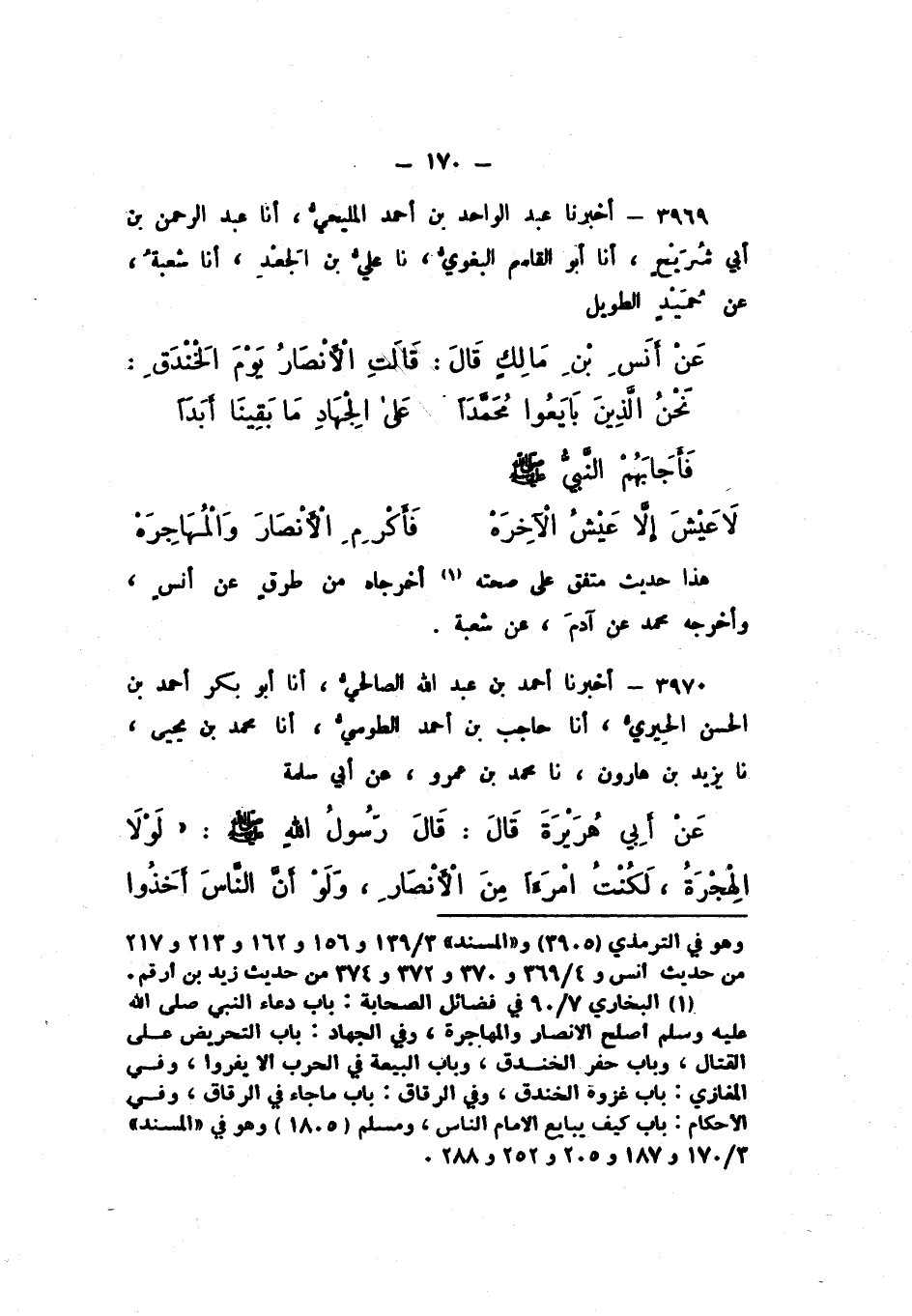 3969 - أَخْبَرَنَا عَبْدُ الْوَاحِدِ بْنُ أَحْمَدَ الْمَلِيحِيُّ، أَنَا عَبْدُ الرَّحْمَنِ بْنُ أَبِي شُرَيْحٍ، أَنَا أَبُو الْقَاسِمِ الْبَغَوِيُّ، نَا عَلِيُّ بْنُ الْجَعْدِ، أَنَا شُعْبَةُ، عَنْ حُمَيْدٍ الطَّوِيلِ، عَنْ أَنَسِ بْنِ مَالِكٍ، قَالَ: قَالَتِ الأَنْصَارُ يَوْمَ الْخَنْدَقِ: