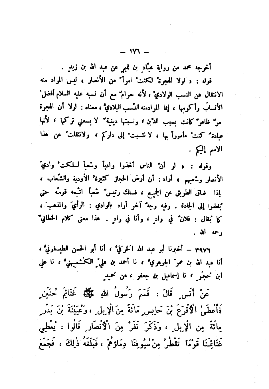 3976 - أَخْبَرَنَا أَبُو عَبْدِ اللَّهِ الْخِرَقِيُّ، أَنَا أَبُو الْحَسَنِ الطَّيْسَفُونِيُّ، أَنَا عَبْدُ اللَّهِ بْنُ عُمَرَ الْجَوْهَرِيُّ، نَا أَحْمَدُ بْنُ عَلِيٍّ الْكُشْمِيهَنِيُّ، نَا عَلِيُّ بْنُ حُجْرٍ، نَا إِسْمَاعِيلُ بْنُ جَعْفَرٍ، عَنْ حُمَيْدٍ، عَنْ أَنَسٍ، قَالَ: قَسَمَ رَسُولُ اللَّهِ صَلَّى اللهُ عَلَيْهِ وَسَلَّمَ غَنَائِمَ حُنَيْنٍ فَأَعْطَى الأَقْرَعَ بْنَ حَابِسٍ مِائَةً مِنَ الإِبِلِ، وَعُيَيْنَةَ بْنَ بَدْرٍ مِائَةً مِنَ الإِبِلِ، وَذَكَرَ نَفَرٌ مِنَ الأَنْصَارِ، قَالُوا: يُعْطِي غَنَائِمَنَا قَوْمًا تَقْطُرُ مِنْ سُيُوفِنَا دِمَاؤُهُمْ، فَبَلَغَهُ ذَلِكَ، فَجَمَعَ