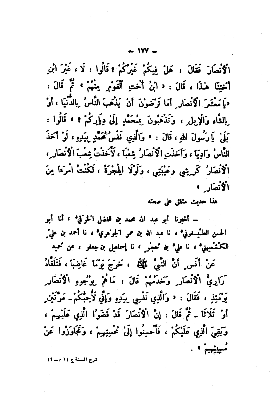 الأَنْصَارَ، فَقَالَ: «هَلْ فِيكُمْ غَيْرُكُمْ؟» قَالُوا: لَا، غَيْرَ ابْنِ أُخْتِنَا هَذَا، قَالَ: «ابْنُ أُخْتِ الْقَوْمِ مِنْهُمْ»، ثُمَّ قَالَ: «يَا مَعْشَرَ الأَنْصَارِ، أَمَا تَرْضَوْنَ أَنْ يَذْهَبَ النَّاسُ بِالدُّنْيَا، أَوْ بِالشَّاءِ وَالإِبِلِ، وَتَذْهَبُونَ بِمُحَمَّدٍ إِلَى دِيَارِكُمْ؟»، قَالُوا: بَلَى يَا رَسُولَ اللَّهِ، قَالَ: «وَالَّذِي نَفْسُ مُحَمَّدٍ بِيَدِهِ، لَوْ أَخَذَ النَّاسُ وَادِيًا، وَأَخَذَتِ الأَنْصَارُ شِعْبًا، لأَخَذْتُ شِعْبَ الأَنْصَارِ، الأَنْصَارُ كَرِشِي وَعَيْبَتِي، وَلَوْلا الْهِجْرَةُ، لَكُنْتُ امْرَأً مِنَ الأَنْصَارِ».