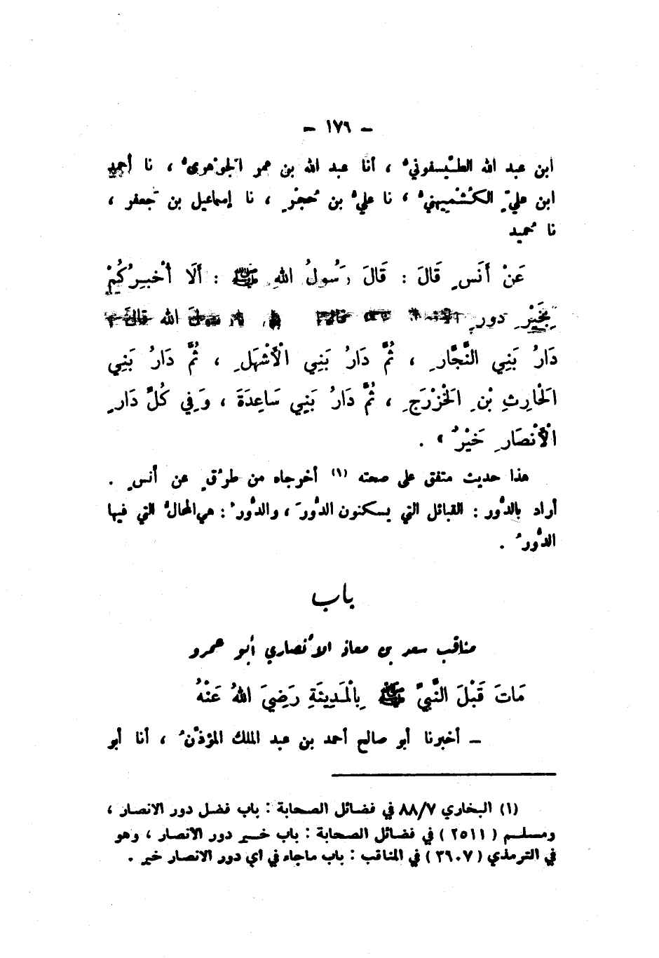 بْنُ عَبْدِ اللَّهِ الطَّيْسَفُونِيُّ، أَنَا عَبْدُ اللَّهِ بْنُ عُمَرَ الْجَوْهَرِيُّ، نَا أَحْمَدُ بْنُ عَلِيٍّ الْكُشْمِيهَنِيُّ، نَا عَلِيُّ بْنُ حُجْرٍ، نَا إِسْمَاعِيلُ بْنُ جَعْفَرٍ، نَا حُمَيْدٌ، عَنْ أَنَسٍ، قَالَ: قَالَ رَسُولُ اللَّهِ صَلَّى اللهُ عَلَيْهِ وَسَلَّمَ: «أَلا أُخْبِرُكُمْ بِخَيْرِ دُورِ الأَنْصَارِ؟»، قَالُوا: بَلَى يَا رَسُولَ اللَّهِ، قَالَ: «دَارُ بَنِي النَّجَّارِ، ثُمَّ دَارُ بَنِي الأَشْهَلِ، ثُمَّ دَارُ بَنِي الْحَارِثِ بْنِ الْخَزْرَجِ، ثُمَّ دَارُ بَنِي سَاعِدَةَ، وَفِي كُلِّ دَارِ الأَنْصَارِ خَيْرٌ».