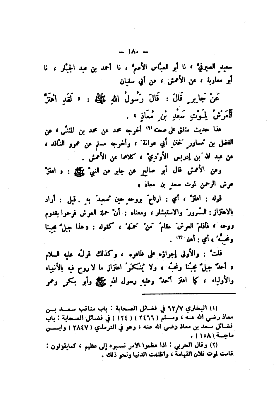 سَعِيدٍ الصَّيْرَفِيُّ، نَا أَبُو الْعَبَّاسِ الأَصَمُّ، نَا أَحْمَدُ بْنُ عَبْدِ الْجَبَّارِ، نَا أَبُو مُعَاوِيَةَ، عَنِ الأَعْمَشِ، عَنْ أَبِي سُفْيَانَ، عَنْ جَابِرٍ، قَالَ: قَالَ رَسُولُ اللَّهِ صَلَّى اللهُ عَلَيْهِ وَسَلَّمَ: «لَقَدِ اهْتَزَّ الْعَرْشُ لِمَوْتِ سَعْدِ بْنِ مُعَاذٍ».