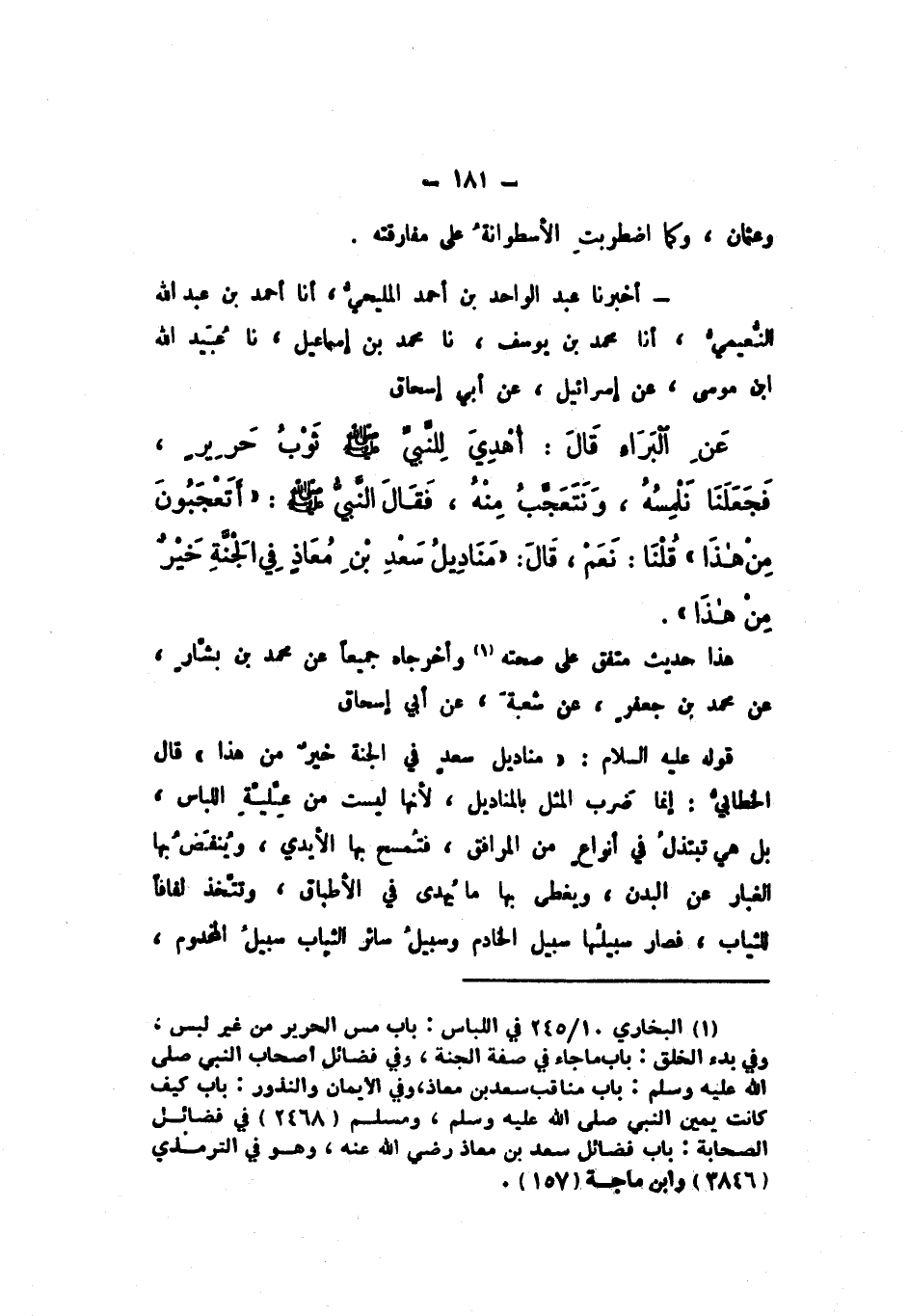 أَخْبَرَنَا عَبْدُ الْوَاحِدِ بْنُ أَحْمَدَ الْمَلِيحِيُّ، أَنَا أَحْمَدُ بْنُ عَبْدِ اللَّهِ النُّعَيْمِيُّ، أَنَا مُحَمَّدُ بْنُ يُوسُفَ، نَا مُحَمَّدُ بْنُ إِسْمَاعِيلَ، نَا عُبَيْدُ اللَّهِ بْنُ مُوسَى، عَنْ إِسْرَائِيلَ، عَنْ أَبِي إِسْحَاقَ، عَنِ الْبَرَاءِ، قَالَ: أُهْدِيَ لِلنَّبِيِّ صَلَّى اللهُ عَلَيْهِ وَسَلَّمَ ثَوْبَ حَرِيرٍ، فَجَعَلْنَا نَلْمَسُهُ، وَنَتَعَجَّبُ مِنْهُ، فَقَالَ النَّبِيُّ صَلَّى اللهُ عَلَيْهِ وَسَلَّمَ: «أَتَعْجَبُونَ مِنْ هَذَا»، قُلْنَا: نَعَمْ، قَالَ: «مَنَادِيلُ سَعْدِ بْنِ مُعَاذٍ فِي الْجَنَّةِ خَيْرٌ مِنْ هَذَا».