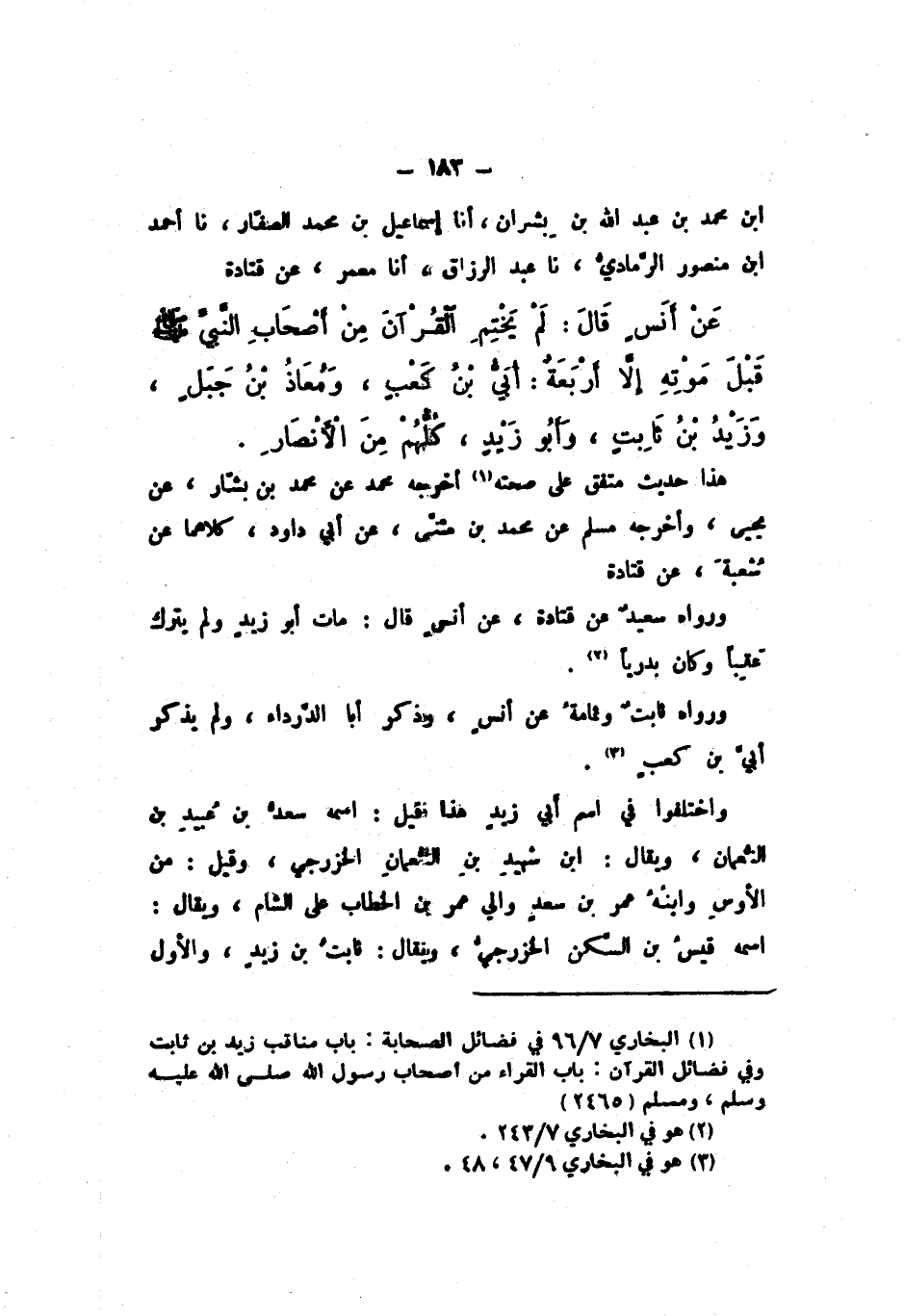 بْنُ مُحَمَّدِ بْنِ عَبْدِ اللَّهِ بْنِ بِشْرَانَ، أَنَا إِسْمَاعِيلُ بْنُ مُحَمَّدٍ الصَّفَّارُ، نَا أَحْمَدُ بْنُ مَنْصُورٍ الرَّمَادِيُّ، نَا عَبْدُ الرَّزَّاقِ، أَنَا مَعْمَرٌ، عَنْ قَتَادَةَ، عَنْ أَنَسٍ، قَالَ: " لَمْ يَخْتِمِ الْقُرْآنَ مِنْ أَصْحَابِ النَّبِيِّ صَلَّى اللهُ عَلَيْهِ وَسَلَّمَ قَبْلَ مَوْتِهِ إِلا أَرْبَعَةً: أُبَيُّ بْنُ كَعْبٍ، وَمُعَاذُ بْنُ جَبَلٍ، وَزَيْدُ بْنُ ثَابِتٍ، وَأَبُو زَيْدٍ، كُلُّهُمْ مِنَ الأَنْصَارِ ".