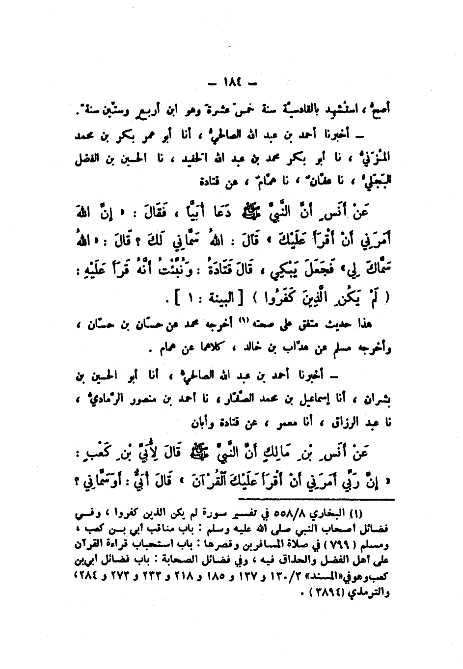 أَخْبَرَنَا أَحْمَدُ بْنُ عَبْدِ اللَّهِ الصَّالِحِيُّ، أَنَا أَبُو عُمَرَ بَكْرُ بْنُ مُحَمَّدٍ الْمُزَنِيُّ، نَا أَبُو بَكْرٍ مُحَمَّدُ بْنُ عَبْدِ اللَّهِ الْحَفِيدُ، نَا الْحُسَيْنُ بْنُ الْفَضْلِ الْبَجَلِيُّ، نَا عَفَّانُ، نَا هَمَّامٌ، عَنْ قَتَادَةَ، عَنْ أَنَسٍ، أَنّ النَّبِيَّ صَلَّى اللهُ عَلَيْهِ وَسَلَّمَ دَعَا أُبَيًّا، فَقَالَ: «إِنَّ اللَّهَ أَمَرَنِي أَنْ أَقْرَأَ عَلَيْكَ»، قَالَ: «اللَّهُ سَمَّانِي لَكَ؟» قَالَ: «اللَّهُ سَمَّاكَ لِي»، فَجَعَلَ يَبْكِي، قَالَ قَتَادَةُ: وَنُبِّئْتُ أَنَّهُ قَرَأَ عَلَيْهِ: {لَمْ يَكُنِ الَّذِينَ كَفَرُوا} [الْبَيِّنَة: 1].