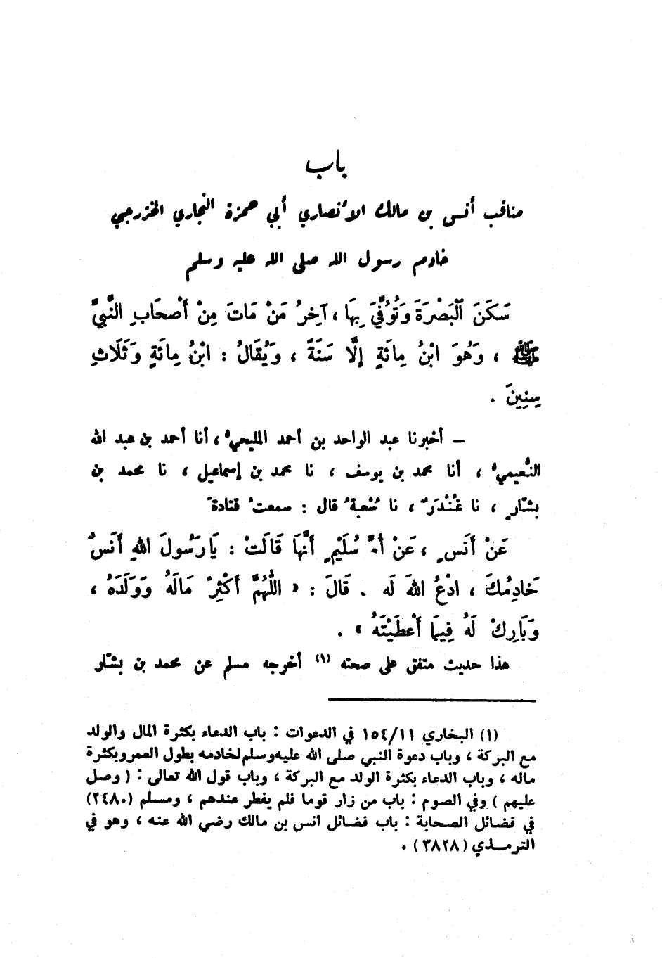 أَخْبَرَنَا عَبْدُ الْوَاحِدِ بْنُ أَحْمَدَ الْمَلِيحِيُّ، أَنَا أَحْمَدُ بْنُ عَبْدِ اللَّهِ النُّعَيْمِيُّ، أَنَا مُحَمَّدُ بْنُ يُوسُفَ، نَا مُحَمَّدُ بْنُ إِسْمَاعِيلَ، نَا مُحَمَّدُ بْنُ بَشَّارٍ، نَا غُنْدَرٌ، نَا شُعْبَةُ، قَالَ: سَمِعْتُ قَتَادَةَ، عَنْ أَنَسٍ، عَنْ أُمِّ سُلَيْمٍ، أَنَّهَا قَالَت: يَا رَسُولَ اللَّهِ، أَنَسٌ خَادِمُكَ، ادْعُ اللَّهَ لَهُ، قَالَ: «اللَّهُمَّ أَكْثِرْ مَالَهُ وَوَلَدَهُ، وَبَارِكْ لَهُ فِيمَا أَعْطَيْتَهُ».