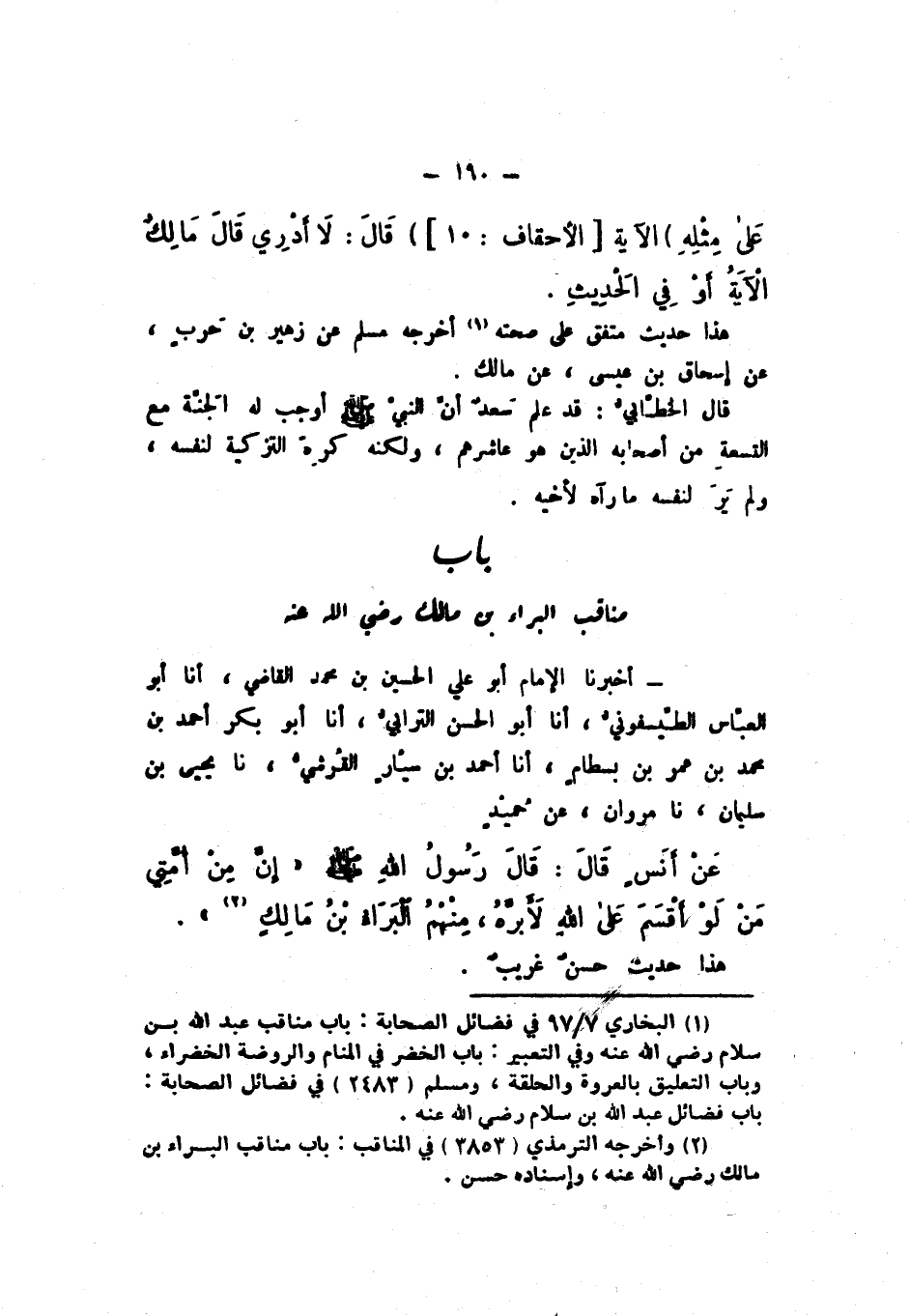 أَخْبَرَنَا الإِمَامُ أَبُو عَلِيٍّ الْحُسَيْنُ بْنُ مُحَمَّدٍ الْقَاضِي، أَنَا أَبُو الْعَبَّاسِ الطَّيْسَفُونِيُّ، أَنَا أَبُو الْحَسَنِ التُّرَابِيُّ، أَنَا أَبُو بَكْرٍ أَحْمَدُ بْنُ مُحَمَّدِ بْنِ عُمَرَ بْنِ بِسْطَامٍ، أَنَا أَحْمَدُ بْنُ سَيَّارٍ الْقُرَشِيُّ، نَا يَحْيَى بْنُ سُلَيْمَانَ، نَا مَرْوَانُ، عَنْ حُمَيْدٍ، عَنْ أَنَسٍ، قَالَ: قَالَ رَسُولُ اللَّهِ صَلَّى اللهُ عَلَيْهِ وَسَلَّمَ: «إِنَّ مِنْ أُمَّتِي مَنْ لَوْ أَقْسَمَ عَلَى اللَّهِ لأَبَرَّهُ، مِنْهُمُ الْبَرَاءُ بْنُ مَالِكٍ».