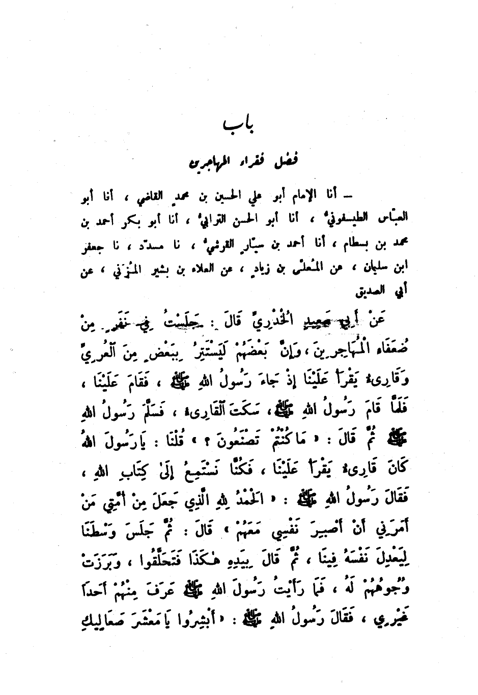 أَنا الإِمَامُ أَبُو عَلِيٍّ الْحُسَيْنُ بْنُ مُحَمَّدٍ الْقَاضِي، أَنَا أَبُو الْعَبَّاسِ الطَّيْسَفُونِيُّ، أَنَا أَبُو الْحَسَنِ التُّرَابِيُّ، أَنَا أَبُو بَكْرٍ أَحْمَدُ بْنُ مُحَمَّدِ بْنِ بِسْطَامٍ، أَنَا أَحْمَدُ بْنُ سَيَّارٍ الْقُرَشِيُّ، نَا مُسَدَّدٌ، نَا جَعْفَرُ بْنُ سُلَيْمَانَ، عَنِ الْمُعَلَّى بْنِ زِيَادٍ، عَنِ الْعَلاءِ بْنِ بَشِيرٍ الْمُزَنِيِّ، عَنْ أَبِي الصِّدِّيقِ، عَنْ أَبِي سَعِيدٍ الْخُدْرِيِّ، قَالَ: جَلَسْتُ فِي نَفَرٍ مِنْ ضُعَفَاءِ الْمُهَاجِرِينَ، وَإِنَّ بَعْضَهُمْ لَيَسْتَتِرُ بِبَعْضٍ مِنَ الْعُرْيِ، وَقَارِئٌ يَقْرَأُ عَلَيْنَا، إِذْ جَاءَ رَسُولُ اللَّهِ صَلَّى اللهُ عَلَيْهِ وَسَلَّمَ فَقَامَ عَلَيْنَا، فَلَمَّا قَامَ رَسُولُ اللَّهِ صَلَّى اللهُ عَلَيْهِ وَسَلَّمَ سَكَتَ الْقَارِئُ، فَسَلَّمَ رَسُولُ اللَّهِ صَلَّى اللهُ عَلَيْهِ وَسَلَّمَ ثُمَّ قَالَ: «مَا كُنْتُمْ تَصْنَعُونَ؟» قُلْنَا: يَا رَسُولَ اللَّهِ، كَانَ قَارِئٌ يَقْرَأُ عَلَيْنَا، فَكُنَّا نَسْتَمِعُ إِلَى كِتَابِ اللَّهِ.