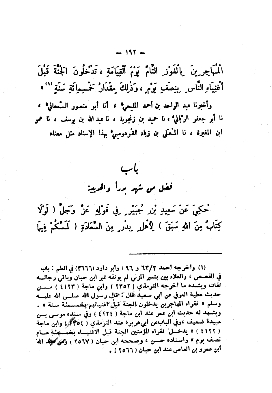 الْمُهَاجِرِينَ بِالْفَوْزِ التَّامِّ يَوْمَ الْقِيَامَةِ، تَدْخُلُونَ الْجَنَّةَ قَبْلَ أَغْنِيَاءِ النَّاسِ بِنَصْفَ يَوْمٍ، وَذَلِكَ مِقْدَارُ خَمْسِ مِائَةِ سَنَةٍ».
