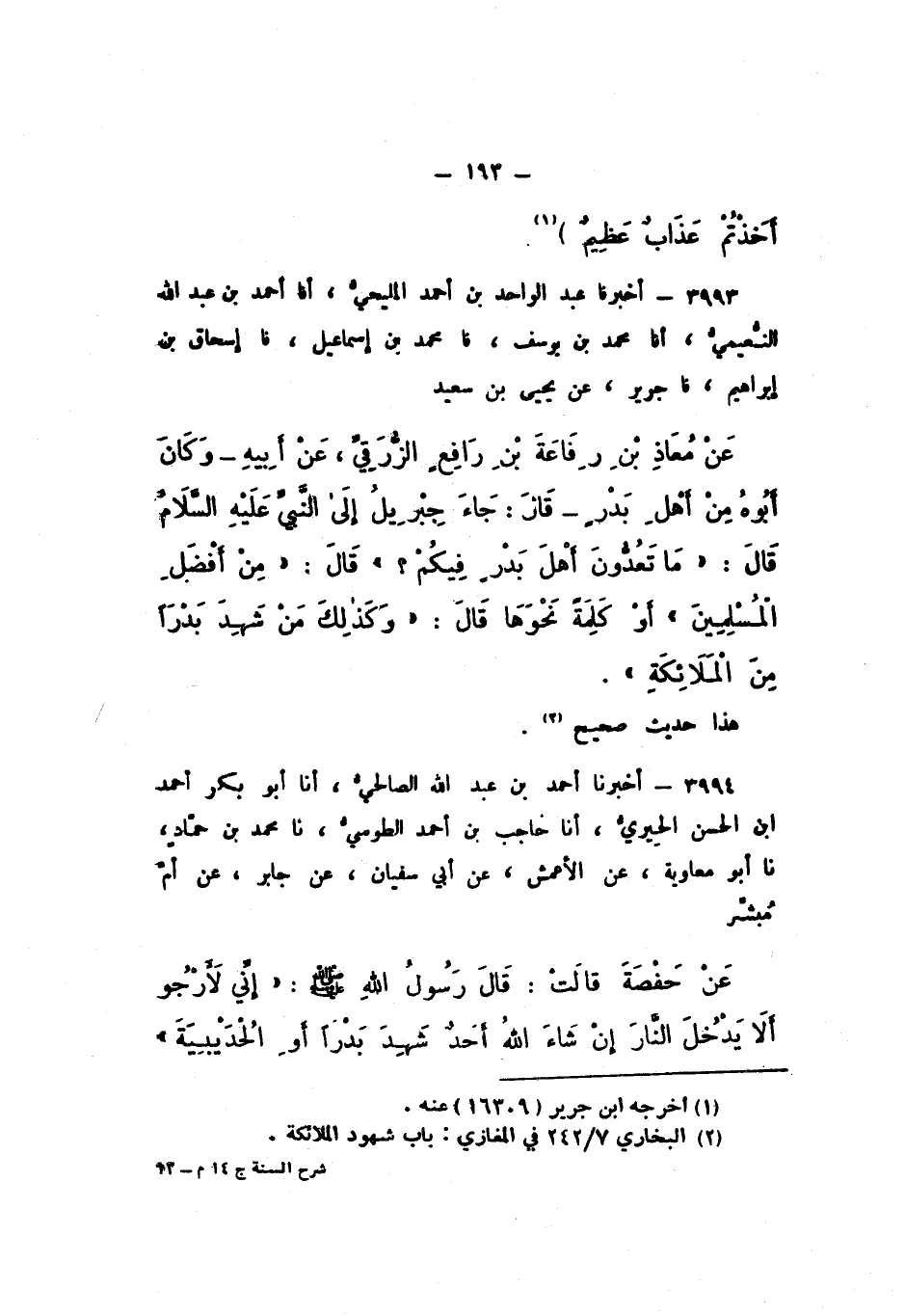 3993 - أَخْبَرَنَا عَبْدُ الْوَاحِدِ بْنُ أَحْمَدَ الْمَلِيحِيُّ، أَنَا أَحْمَدُ بْنُ عَبْدِ اللَّهِ النُّعَيْمِيُّ، أَنَا مُحَمَّدُ بْنُ يُوسُفَ، نَا مُحَمَّدُ بْنُ إِسْمَاعِيلَ، نَا إِسْحَاقُ بْنُ إِبْرَاهِيمَ، نَا جَرِيرٌ، عَنْ يَحْيَى بْنِ سَعِيدٍ، عَنْ مُعَاذِ بْنِ رِفَاعَةَ بْنِ رَافِعٍ الزُّرَقِيُّ، عَنْ أَبِيهِ، وَكَانَ أَبُوهُ مِنْ أَهْلِ بَدْرٍ، قَالَ: جَاءَ جِبْرِيلُ إِلَى النَّبِيِّ عَلَيْهِ السَّلامُ، قَالَ: «مَا تَعُدُّونَ أَهْلَ بَدْرٍ فِيكُمْ؟» قَالَ: «مِنْ أَفْضَلِ الْمُسْلِمِينَ»، أَوْ كَلِمَةً نَحْوَهَا قَالَ: «وَكَذَلِكَ مَنْ شَهِدَ بَدْرًا مِنَ الْمَلائِكَةِ».
