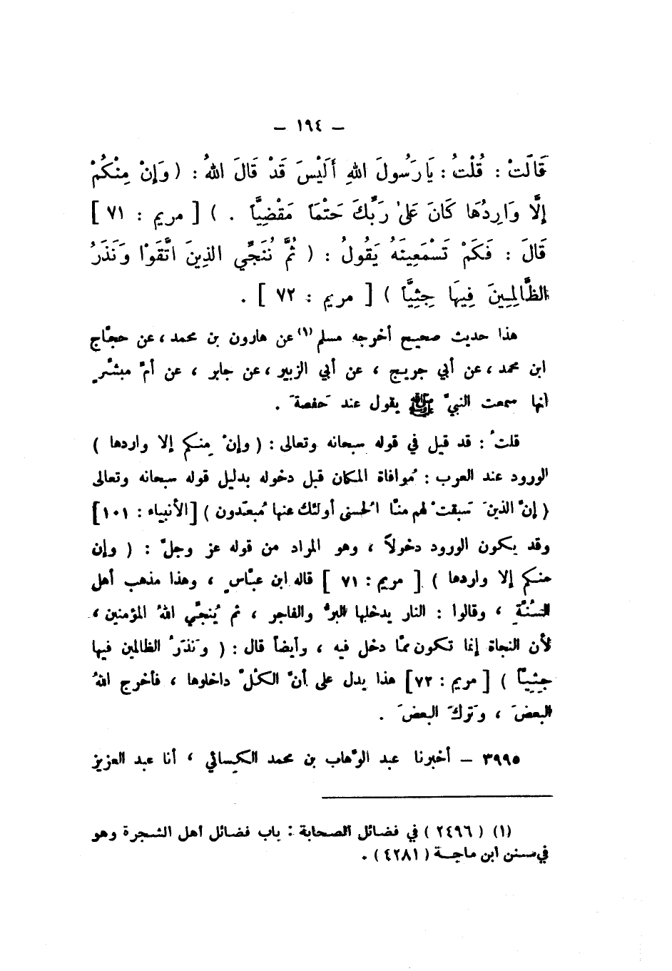 قَالَتْ: قُلْتُ: يَا رَسُولَ اللَّهِ، أَلَيْسَ قَدْ قَالَ اللَّهُ: {وَإِنْ مِنْكُمْ إِلا وَارِدُهَا كَانَ عَلَى رَبِّكَ حَتْمًا مَقْضِيًّا} [مَرْيَم: 71]، قَالَ: " فَكَمْ تَسْمَعِينَهُ يَقُولُ: {ثُمَّ نُنَجِّي الَّذِينَ اتَّقَوْا وَنَذَرُ الظَّالِمِينَ فِيهَا جِثِيًّا} [مَرْيَم: 72] ".